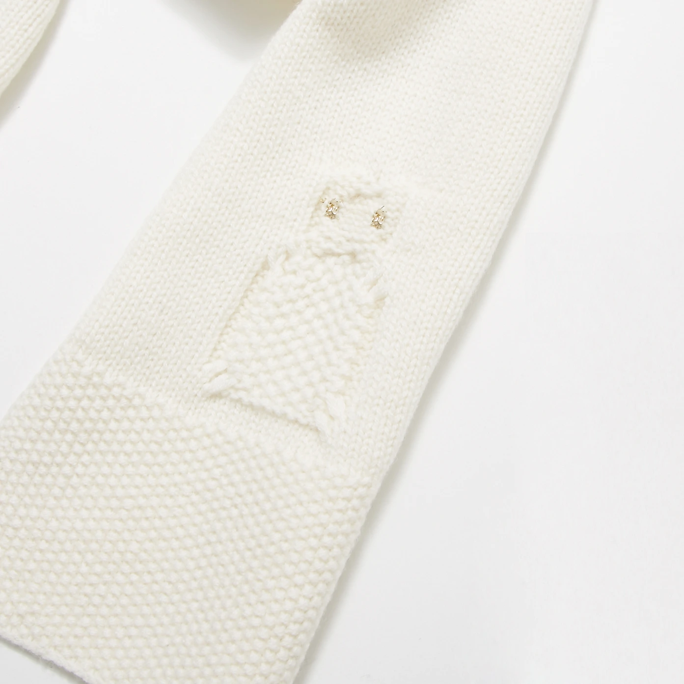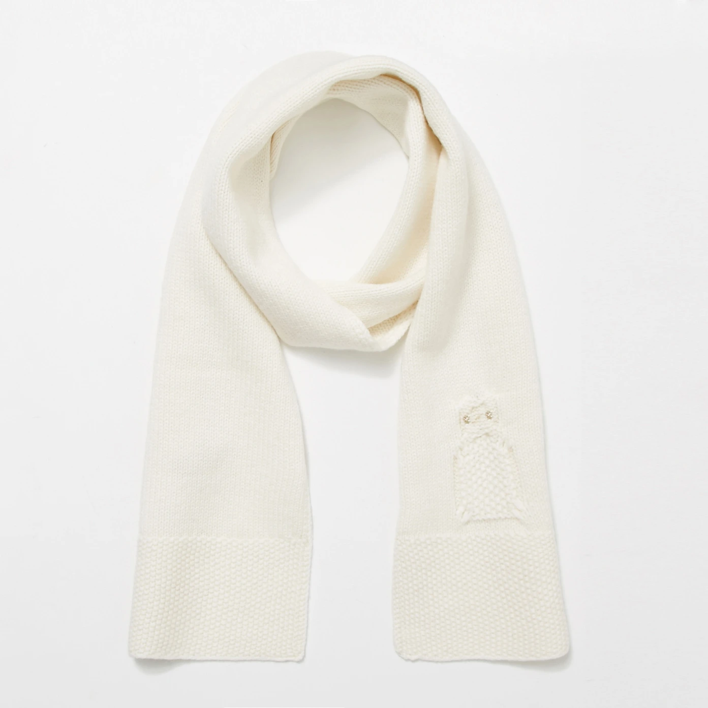 Echarpe en maille fantaisie dessinant une chouette. Elle se coordonne avec son bonnet et ses moufles. Elle s'associe au pull de la collection.