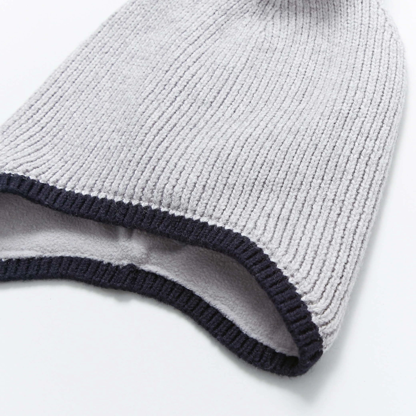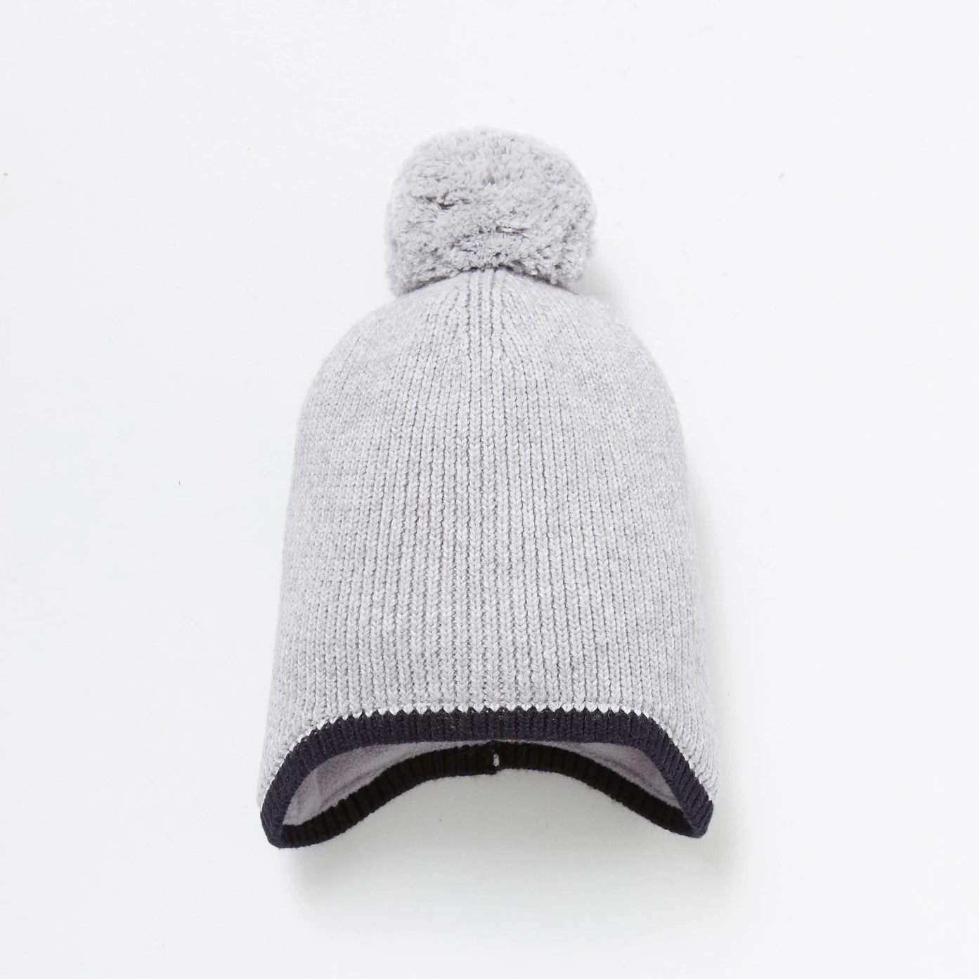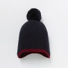 Bonnet à côte 1x1 à pompon doublé en micro-polaire. Sa forme permet de couvrir les oreilles. Il se coordonne à son col et ses moufles.