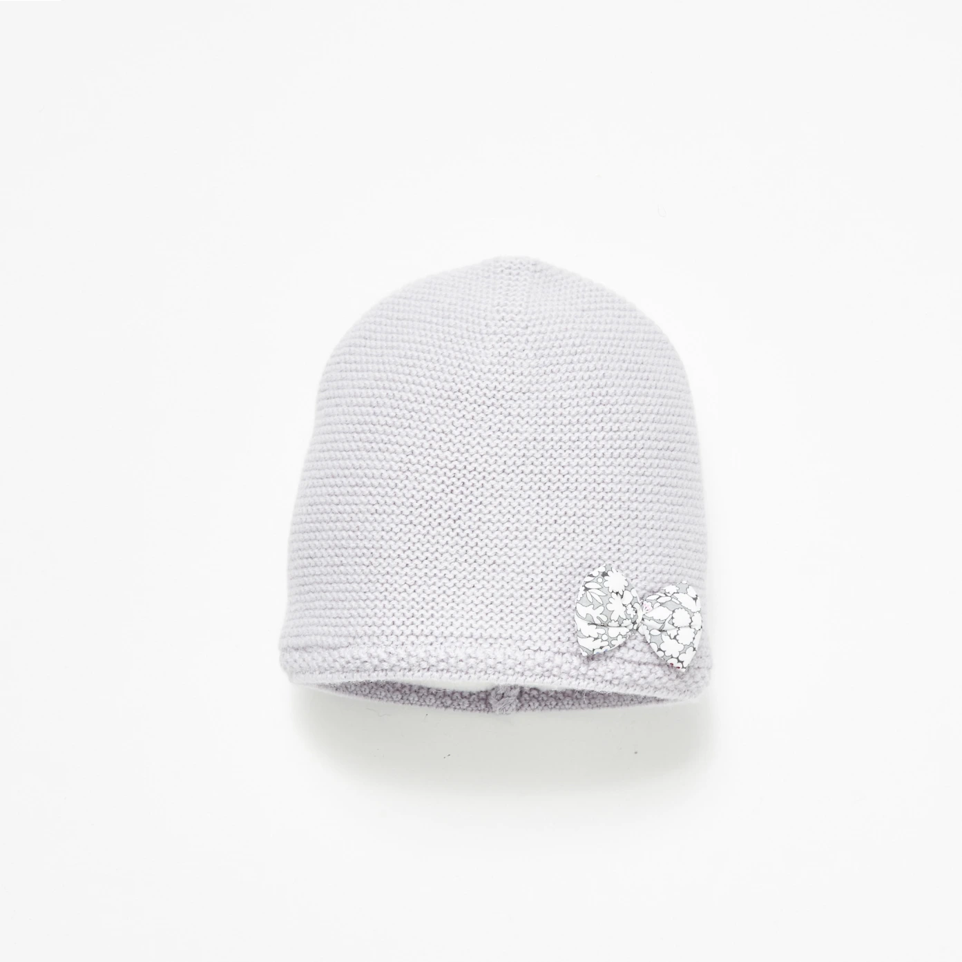 Bonnet en tricot points mousse. Détail de noeuds en Liberty. Doublure micro polaire en gris perle.