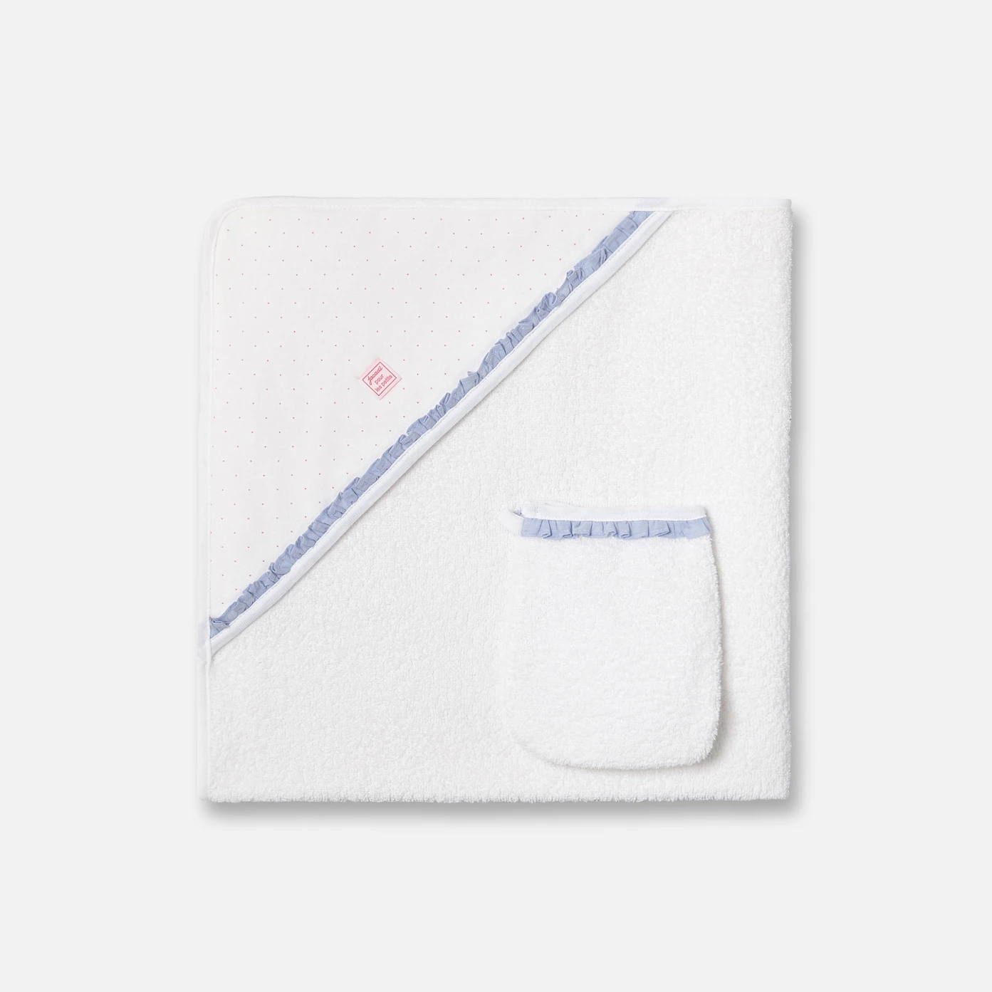 Sortie de bain en éponge 100% coton. La capuche et le dos sont en interlock imprimé pois rose fluo. Détails en fil à fil bleu ciel. Dimensions de la sortie de bain ouverte : 80 x 80 cm. Accompagnée de son gant assorti.