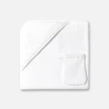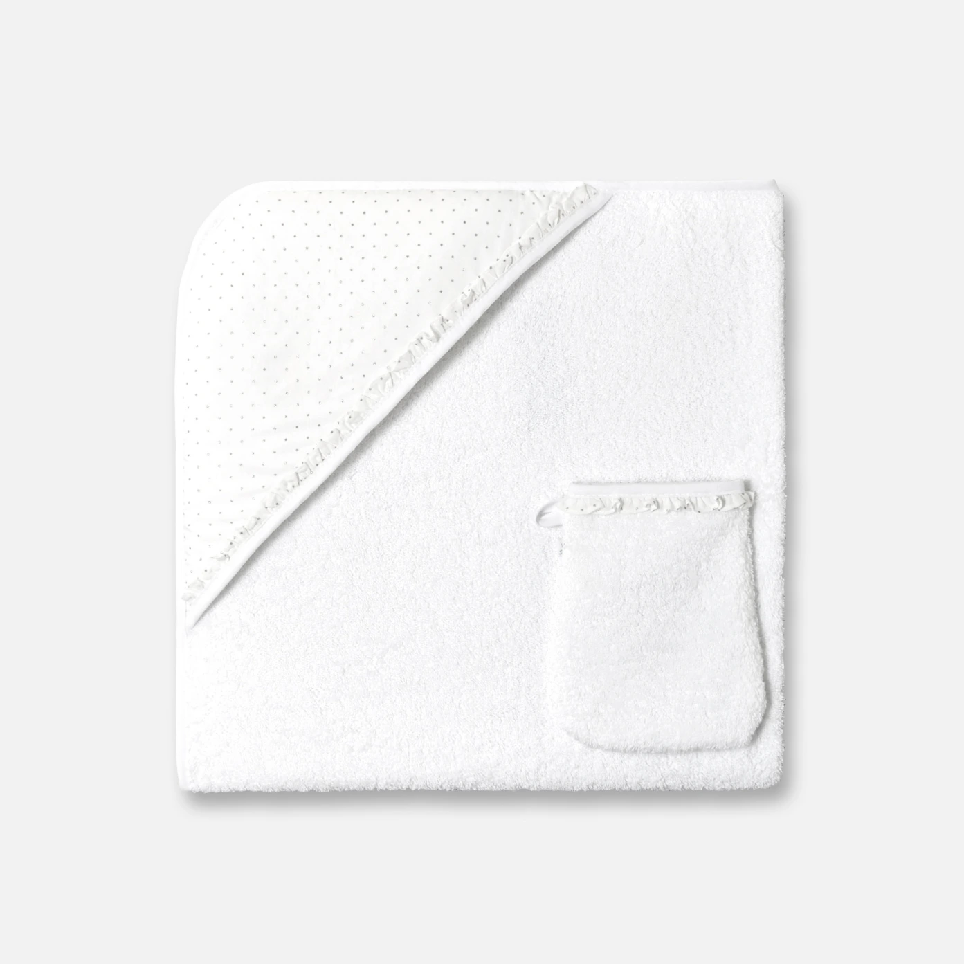 Sortie de bain unie et raffinée, en éponge 100% coton. Jolis détails en popeline imprimée pois lurex. Dimensions de la sortie de bain ouverte : 80 x 80 cm. Elle est accompagnée de son gant assorti.