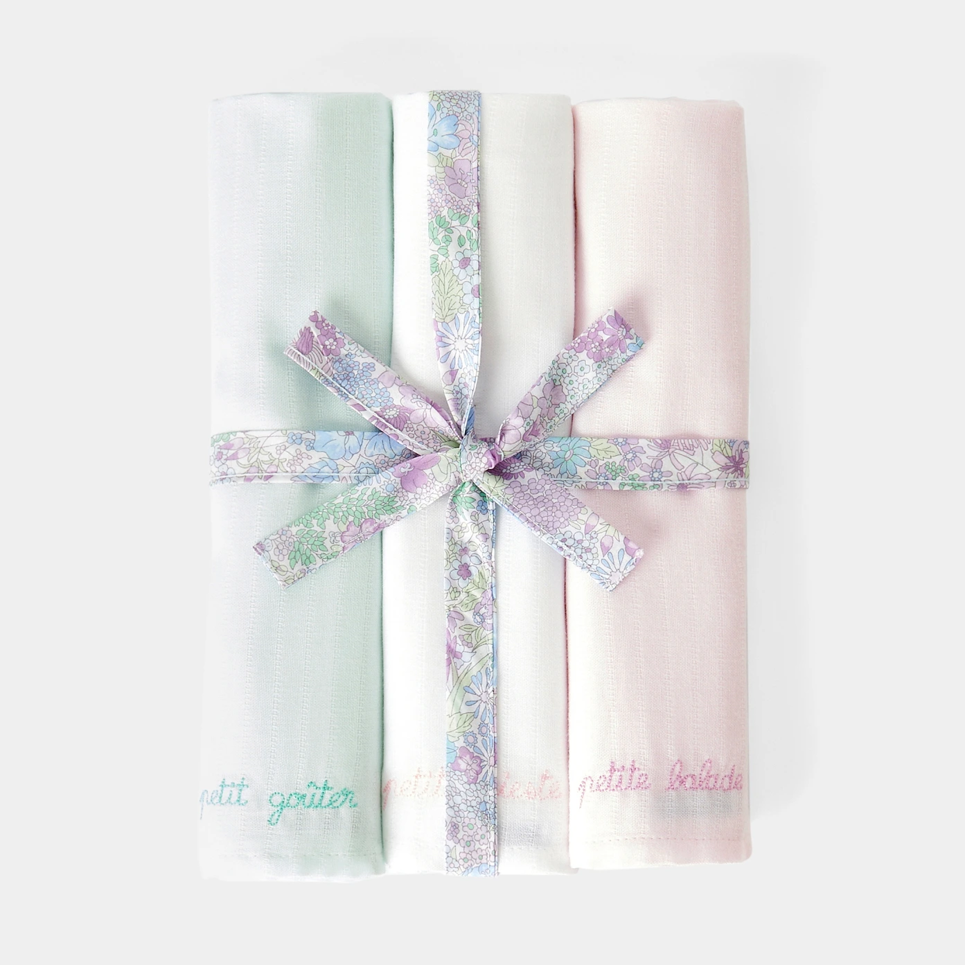 Complétez le premier trousseau de bébé en ajoutant ce lot de langes. En coton doux et léger et joliment brodés, utilisez ces langes multifonction pour protéger les vêtements de bébé lors des repas, le changer ou en guise de doudou. Présentés avec un ruban en tissu Liberty, ils seront parfaits en guise de cadeaux de naissance.- Coton- Broderies- Ruban en tissu Liberty Margareth Annie coloration exclusive Jacadi- Dimensions : 65 x 65 cm