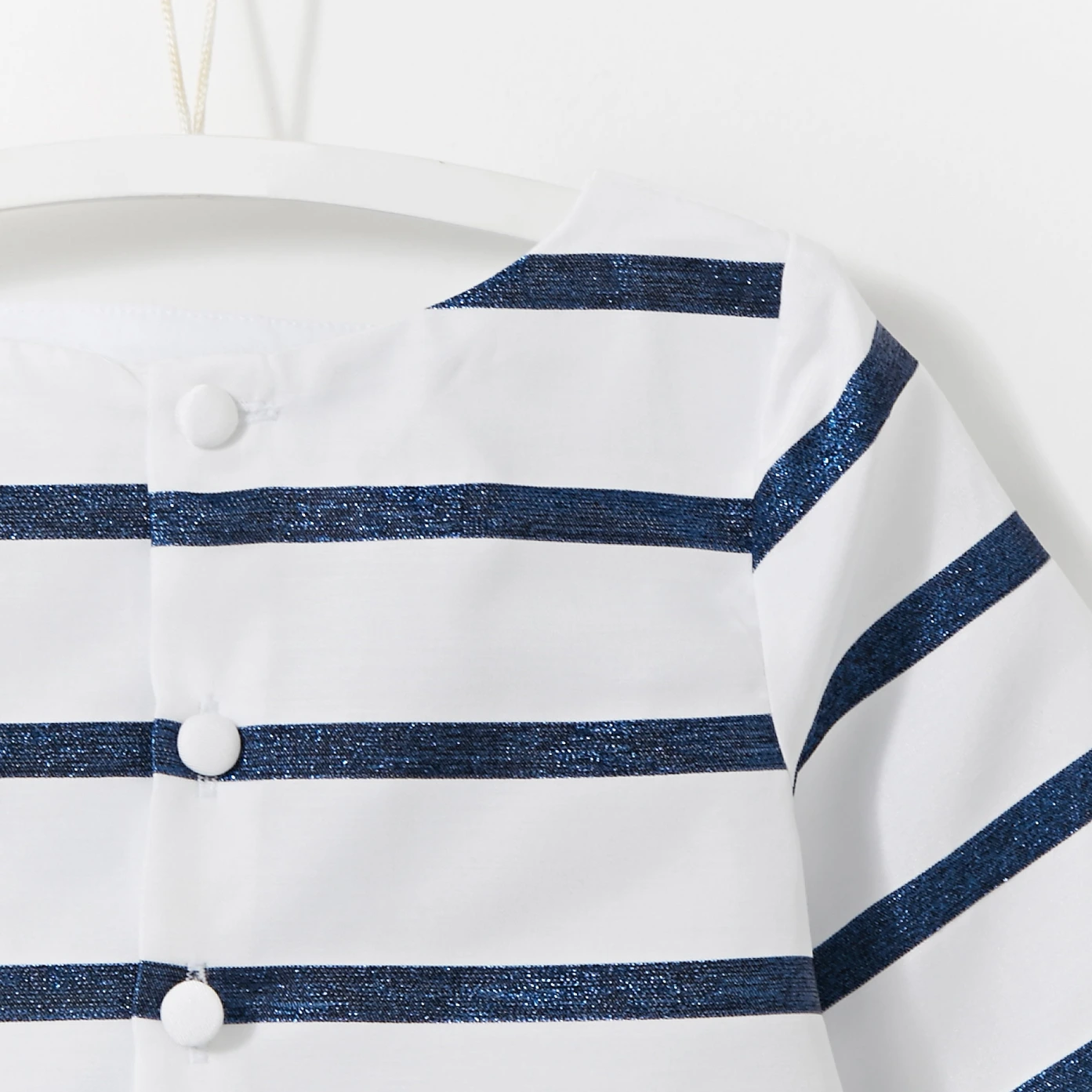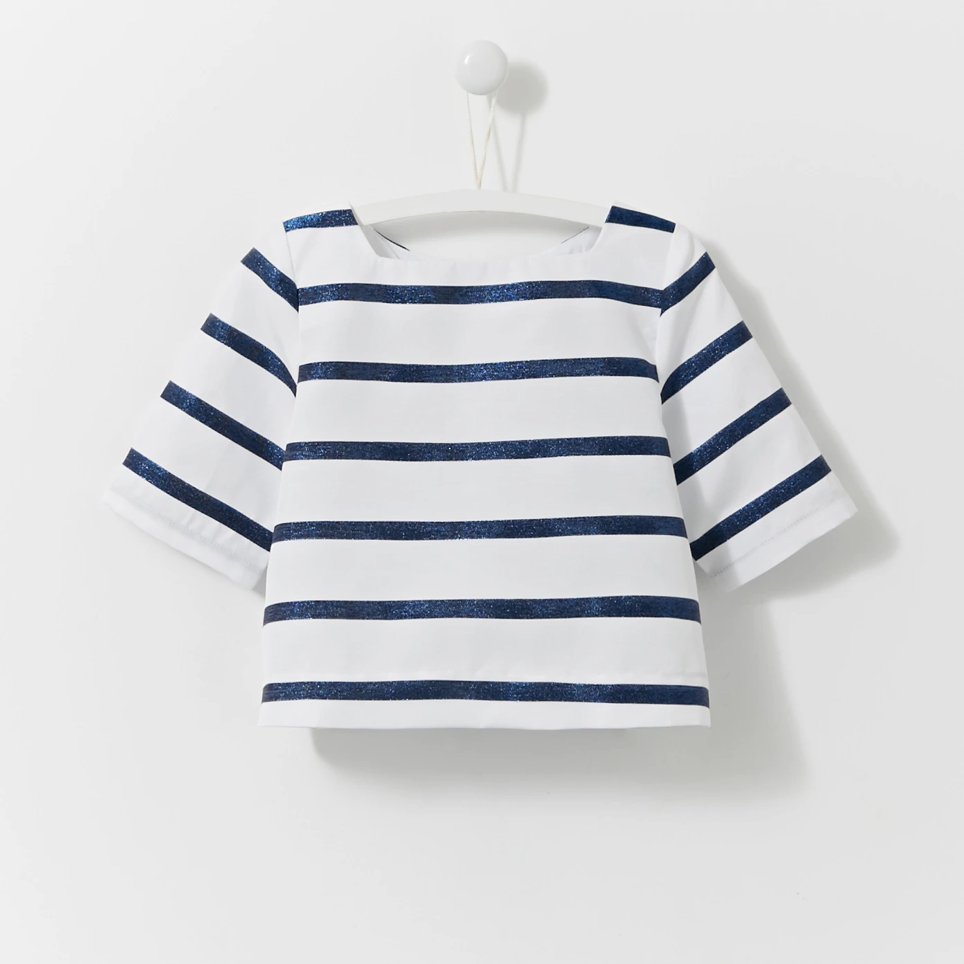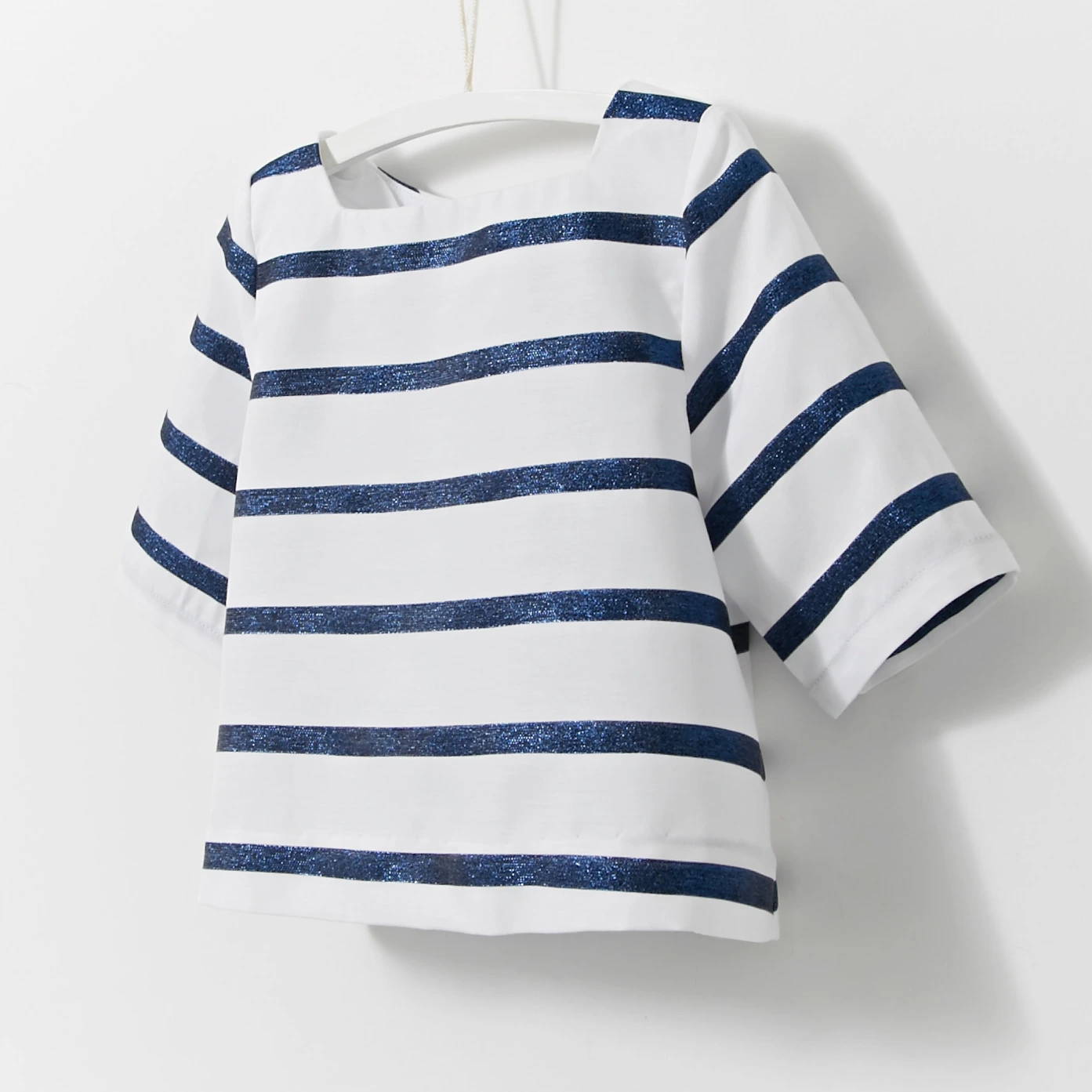 Marinière en satin coton et lurex manches ¾.Encolure carrée. Ouverture milieu dos par une ligne de 5 boutons recouverts. Made in Madagascar