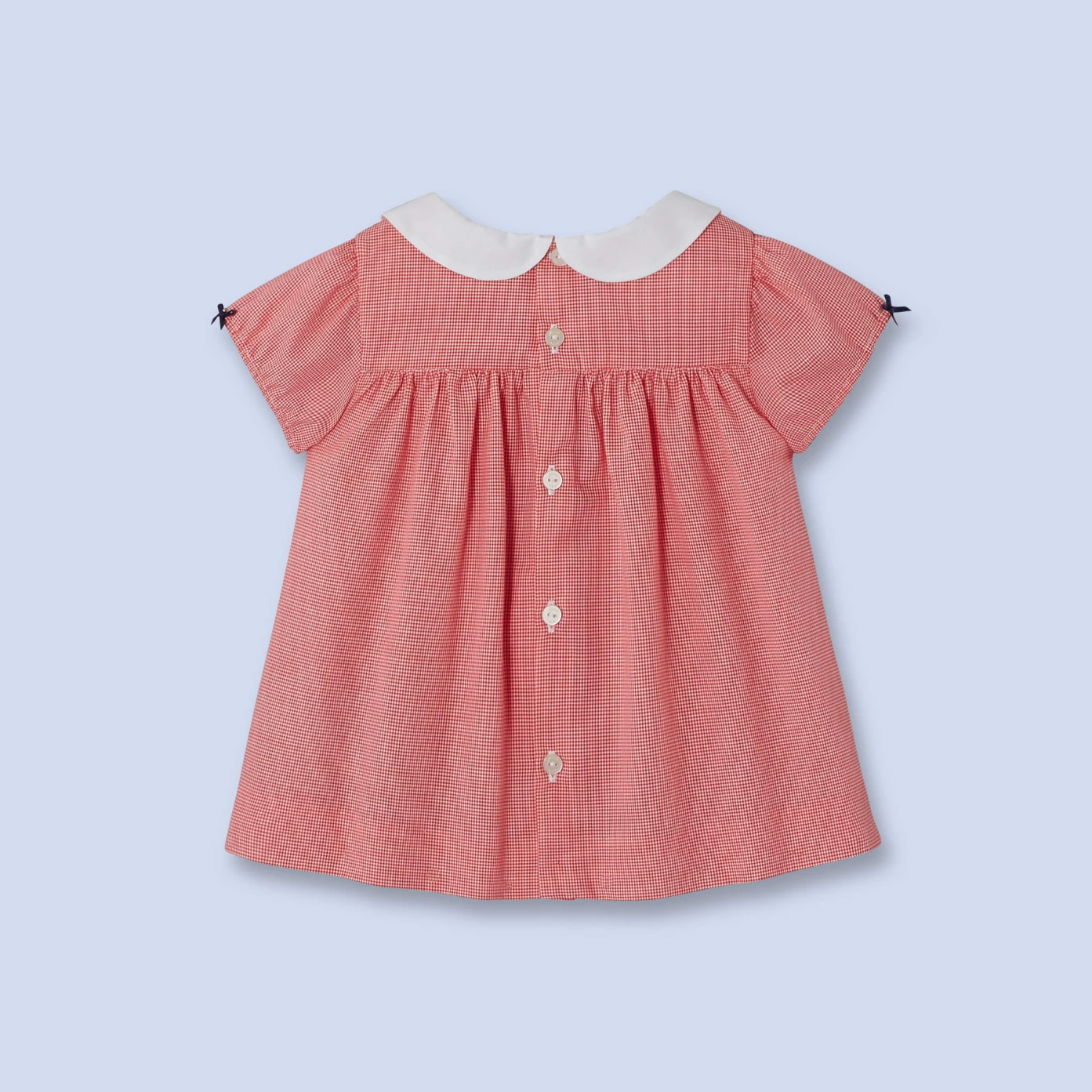 Esprit rétro chic de la blouse en vichy de la toute-petite. Suivant une forme évasée, elle s'orne d'un col claudine blanc. Jeu de fronces pour un effet de volume. Dos boutonné d'imitation nacre.Le plus Jacadi : les nœuds lingerie sur les manches courtes.