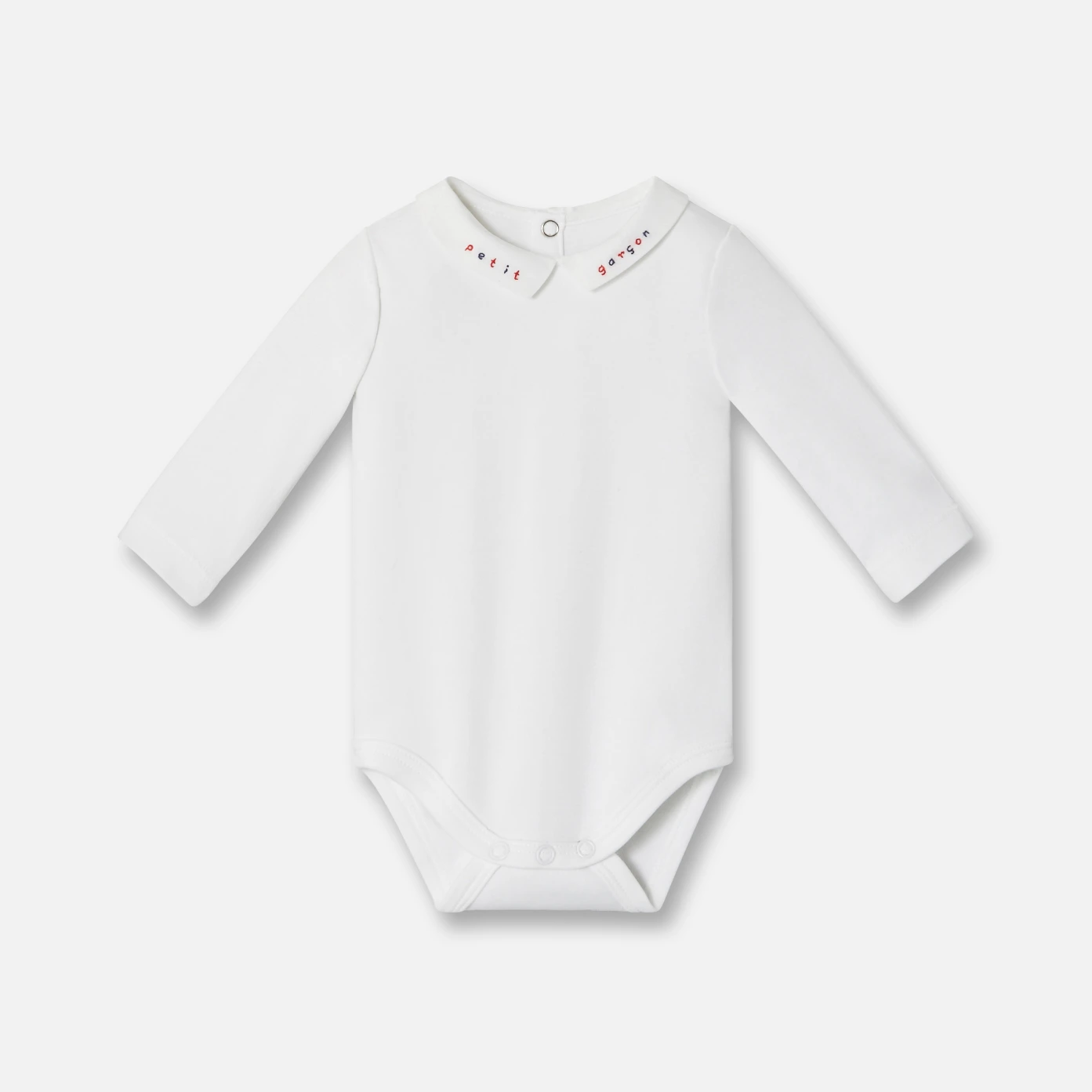 Cadeau de naissance élégant, le body en interlock du tout-petit se pare d'un col en popeline brodé à la main de l'expression