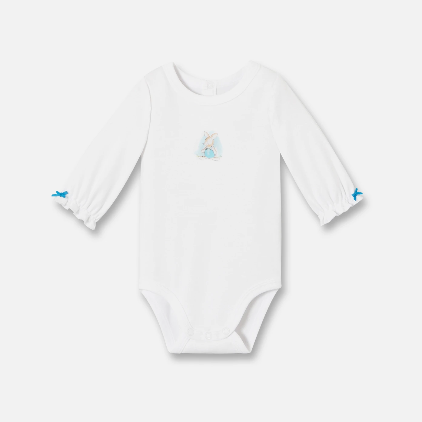 Le petit lapin accompagne la toute-petite sur son 1er body. Il est rehaussé de nœuds lingerie en bas des manches élastiqués. Haut du dos et entrejambe pressionnés.