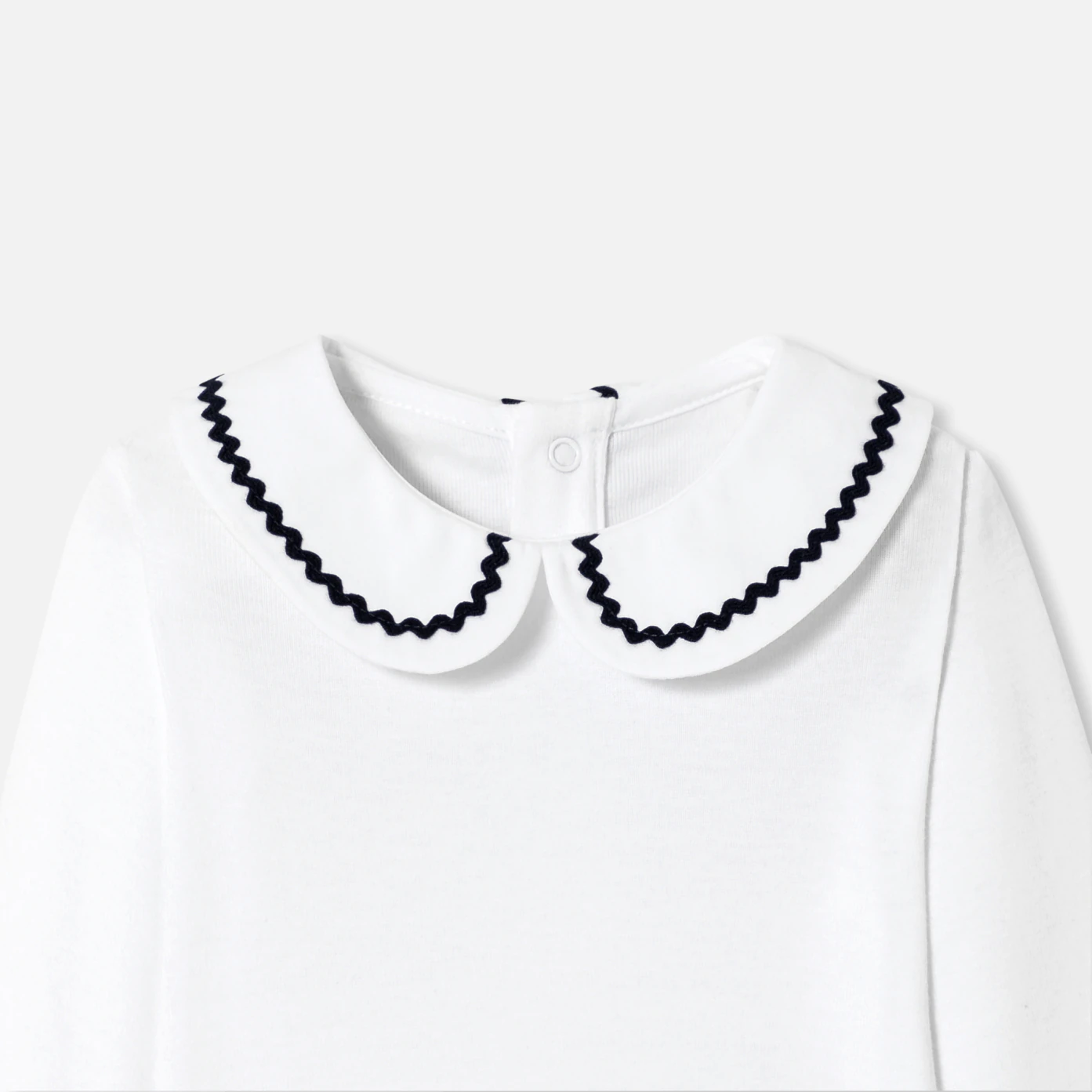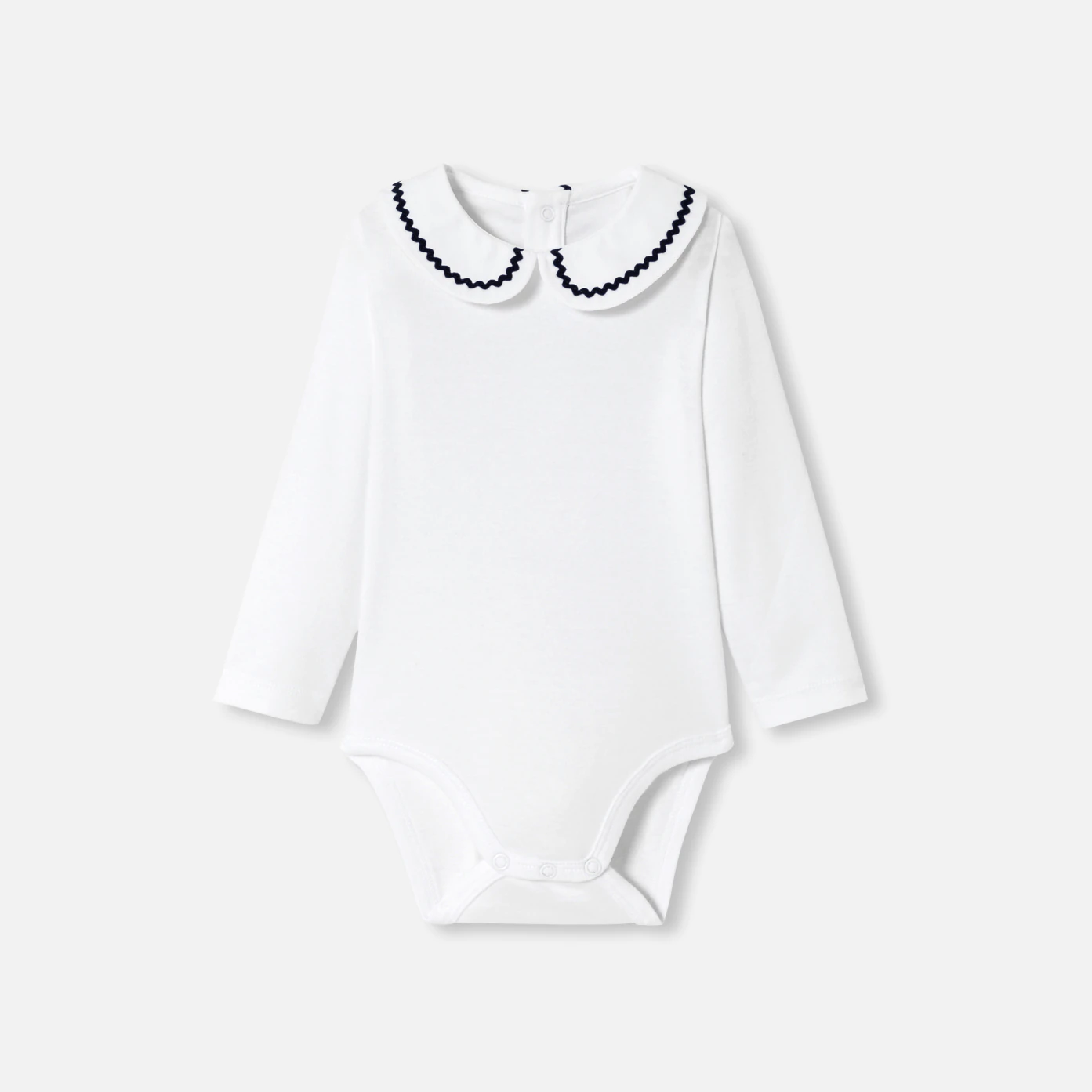 Des journées placées sous le signe de l'élégance avec ce body bébé fille. En coton biologique, son col est orné d'un ravissant ruban croquet contrasté. Idéal pour l'entrée de saison avec ses manches longues, accordez-le à une robe chasuble pour une silhouette chic. - Coton biologique - Manches longues - Col serti d'un ruban croquet - Pressions au dos et à l'entrejambe