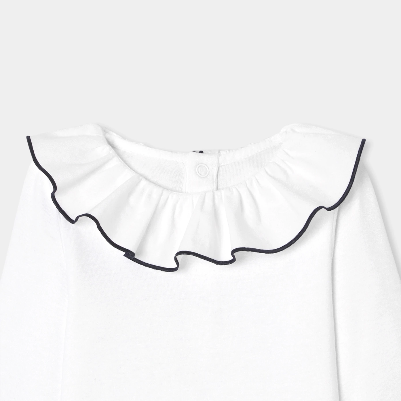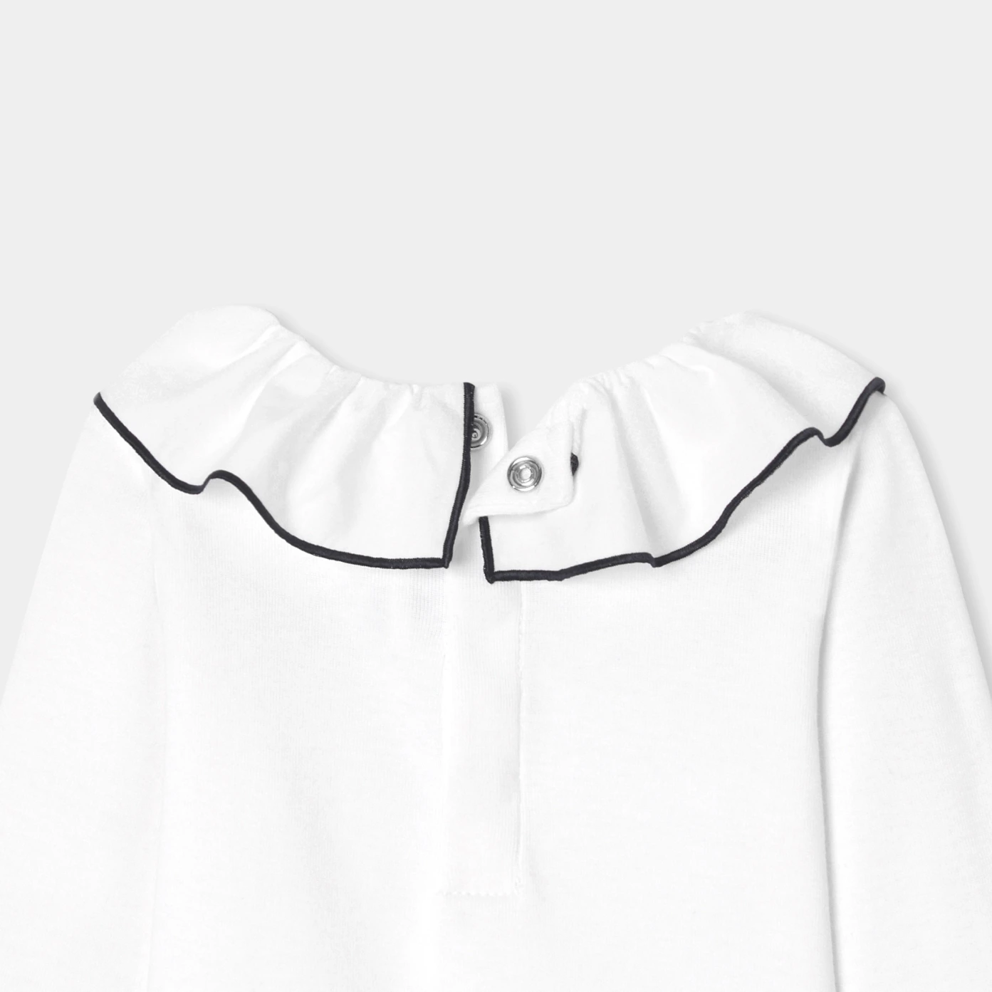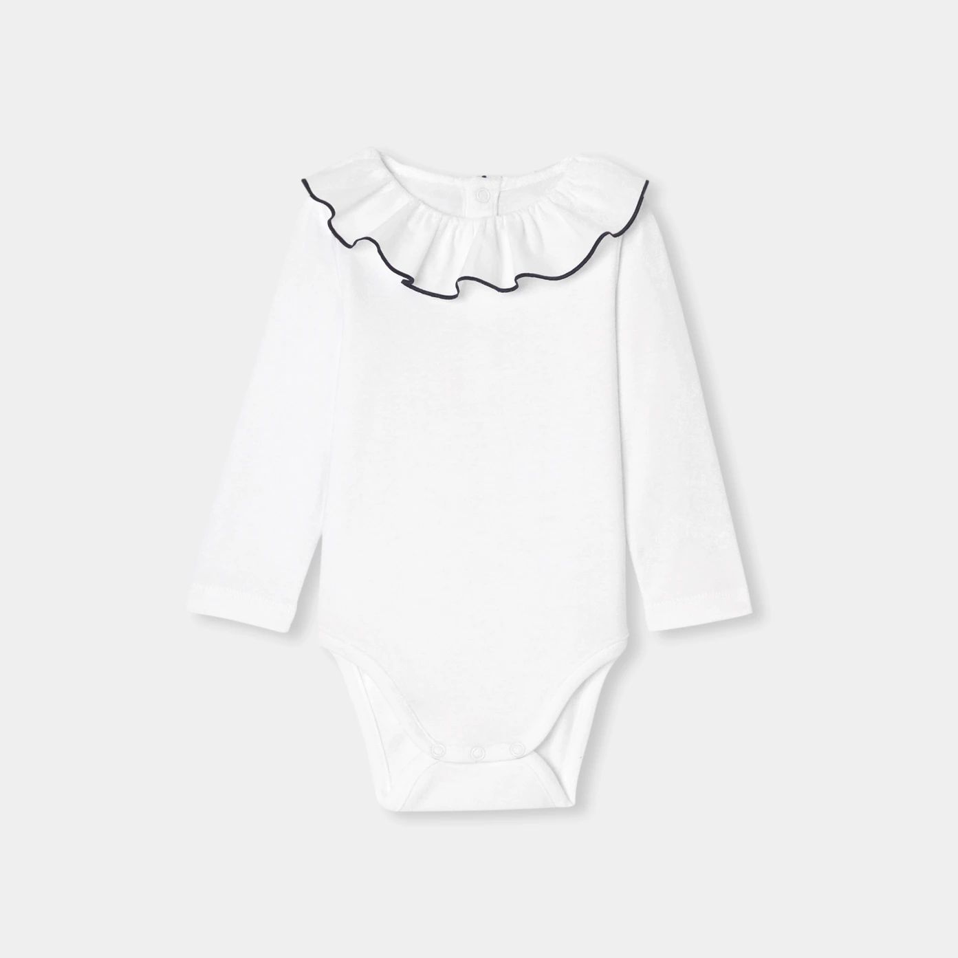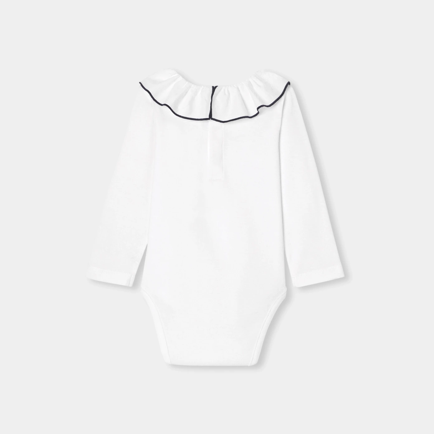 Pour composer une tenue de cérémonie et sublimer les silhouettes du quotidien, le classique body bébé fille se pare d'une large collerette au volume graphique. En jersey de coton doux et confortable, ce modèle pressionné au dos et à l’entrejambe est parfait pour composer son vestiaire de rentrée.- Body bébé fille manches longues- Large collerette surlignée d'un biais marine- Dos et entrejambe pressionnés