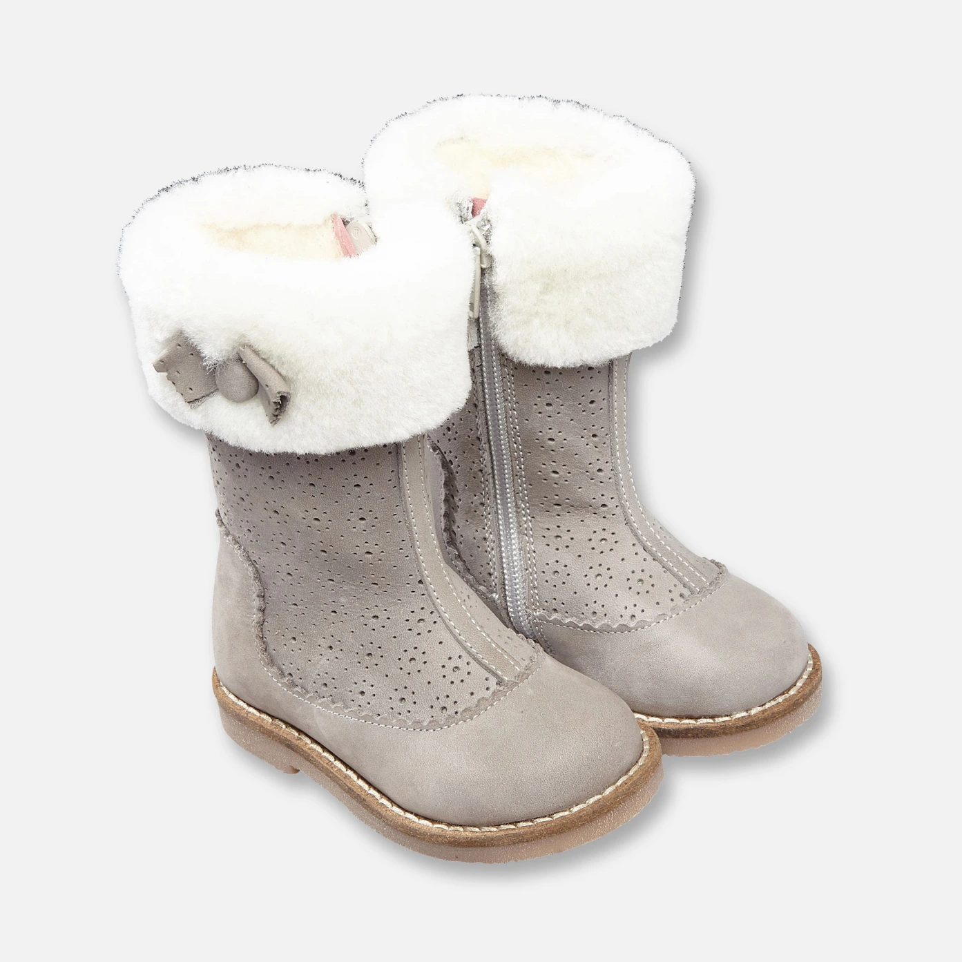 Incontournables pour cet hiver, les bottes en cuir lisse de la toute-petite sont fourrées de laine et rehaussées de nubuck perforé. Détail du col en mouton orné d'un nœud. Zip sur les côtés intérieurs. Première de propreté en cuir.