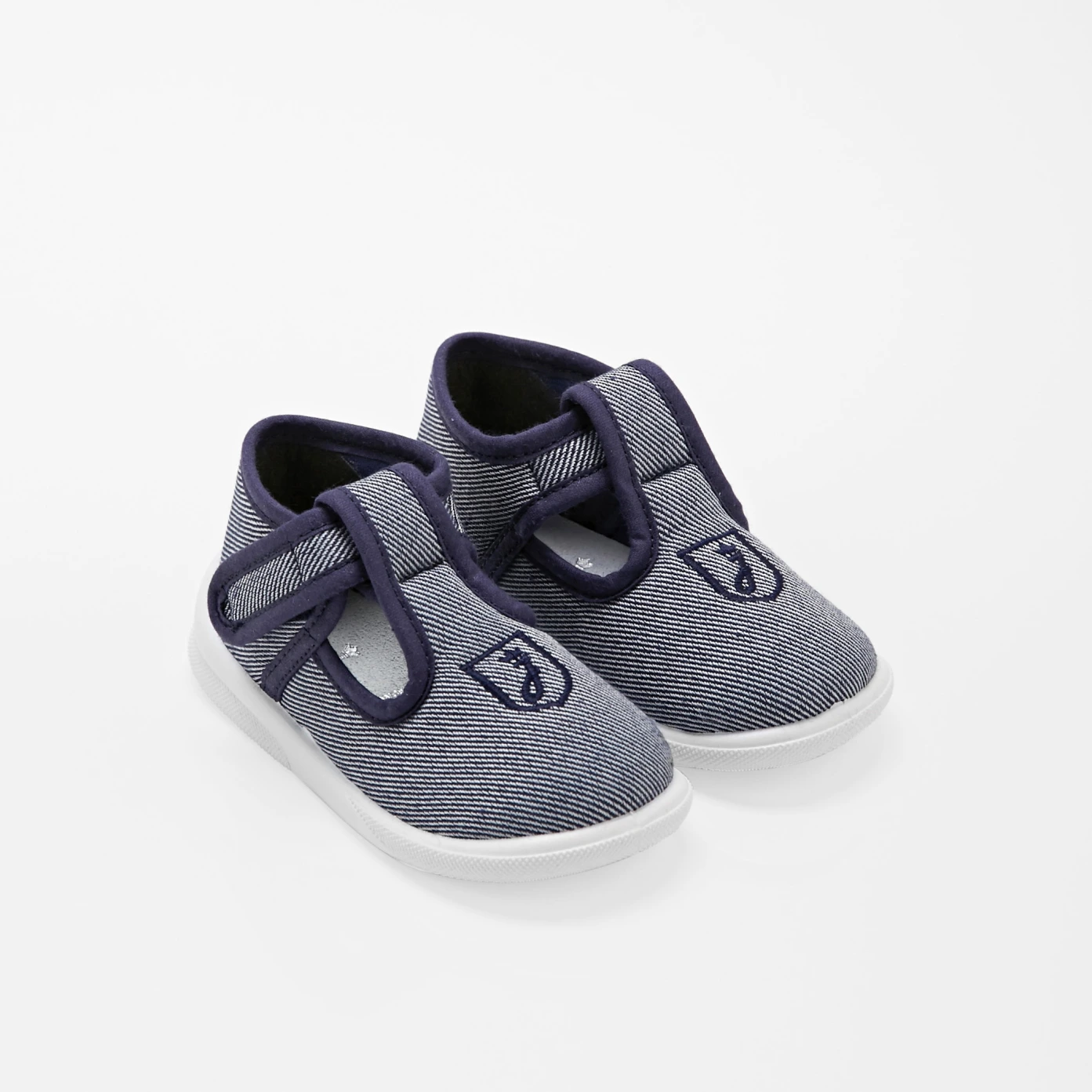 Cette saison, les chaussons se parent d'une toile effet denim pour plus de modernité. Faciles à enfiler grâce à leur bride velcro, ils sont montés sur une semelle en élastomère confortable et apportant un bon maintien du pied. La semelle intérieure est en cuir. Ces chaussons sont fabriqués en France.