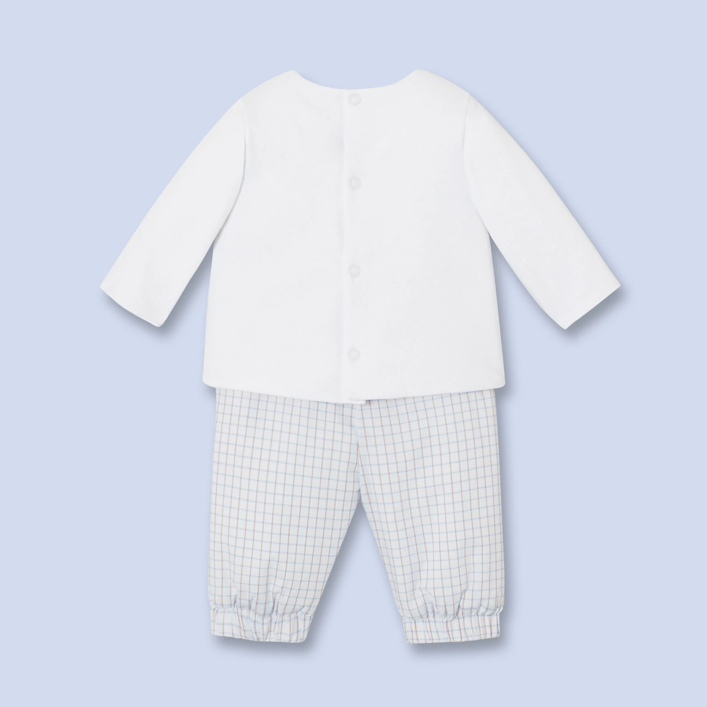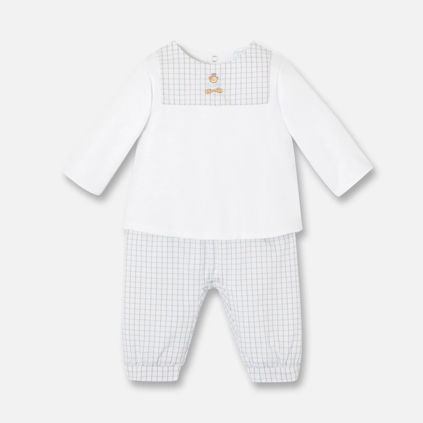 Idéal pour un cadeau de naissance, l'ensemble bébé garçon est brodé à la main d'un ourson devant. Le T-shirt ouatiné et doublé est pressionné au dos. Le pantalon à carreaux, ouatiné et doublé, est élastiqué à la taille.