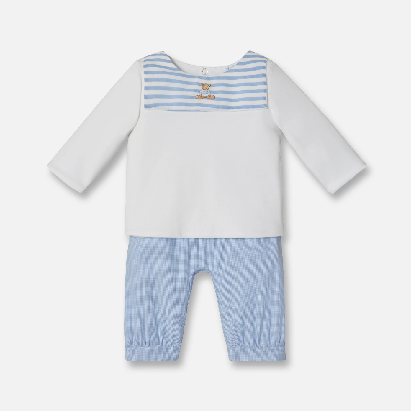 Cadeau de naissance raffiné, l'ensemble du tout-petit. Le haut est brodé à la main d'un ourson sur le col marin. Dos pressionné. Le pantalon en vichy est élastiqué à la taille. Etiquette Jacadi au dos.