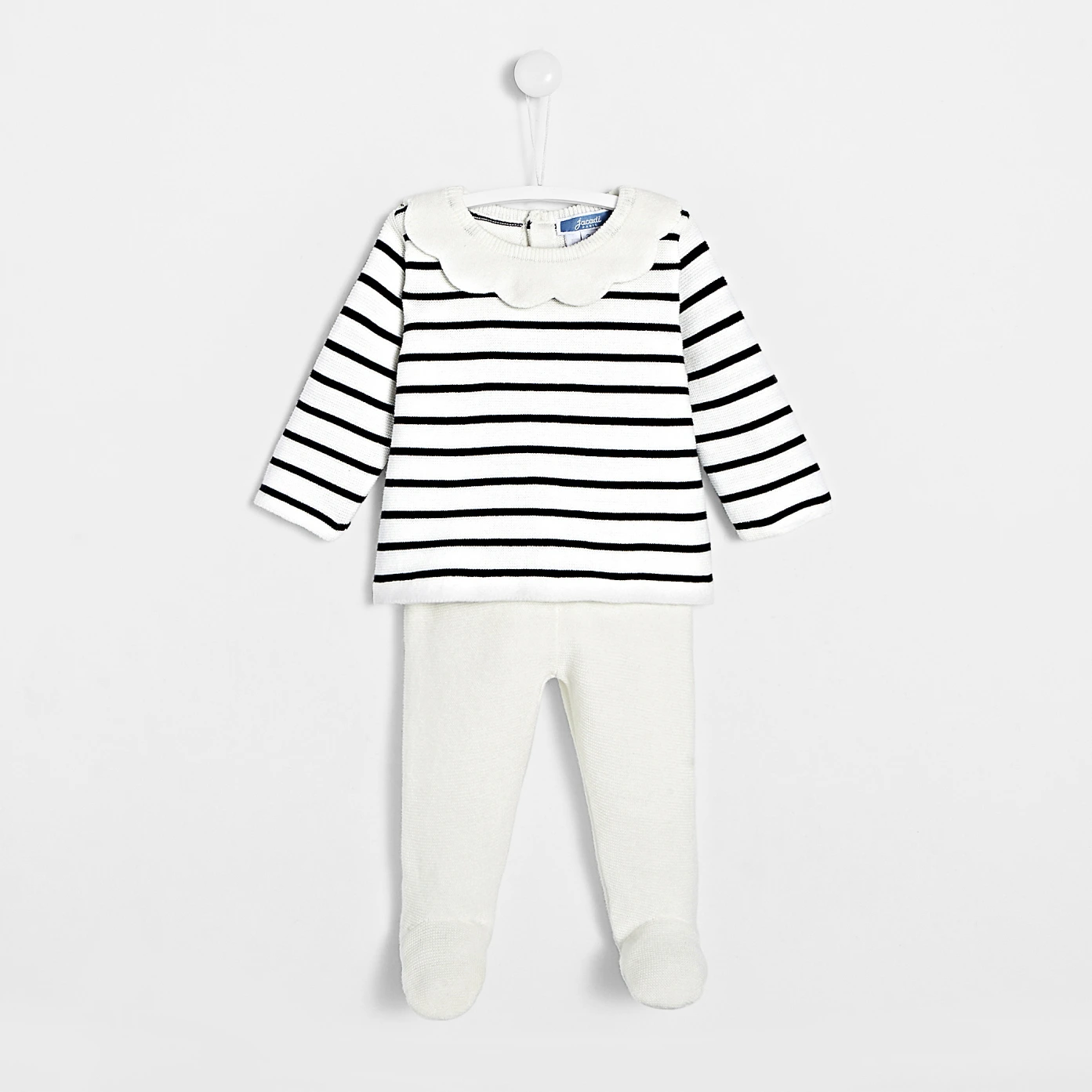 Savoir-faire et maîtrise des codes de l'élégance ont été réunis pour créer cet ensemble pour bébé fille. Composé d'une marinière en point mousse délicatement sertie d'une collerette s'ouvrant au dos par pressions, elle est complétée d'un pantalon à pieds doté d'une taille élastiquée pour un habillage facile. Idéal pour les premiers habillages de bébé, cet ensemble coup de coeur de la collection Trousseau plein de douceur et d'élégance est une jolie idée de cadeau à offrir et pourra être glissé dans la valise de maternité.