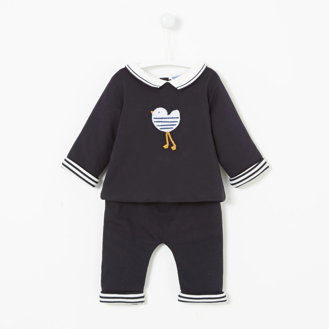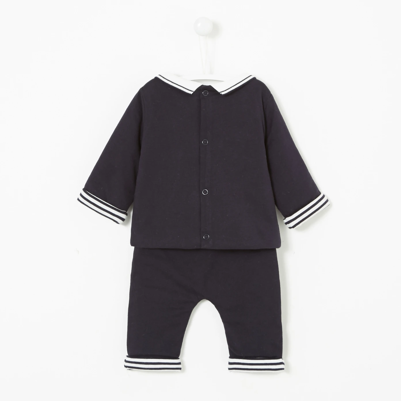 Idéal dès les premiers jours de bébé, cet ensemble en double jersey dévoile des détails très élégants. Avec un pull surmonté d'un col polo en popeline de coton et d'un motif ravissant sur le plastron, le pantalon doté d'une taille élastiquée et d'une ouverture par pression à l'entrejambe dévoile quant à lui un ravissant revers rayé.