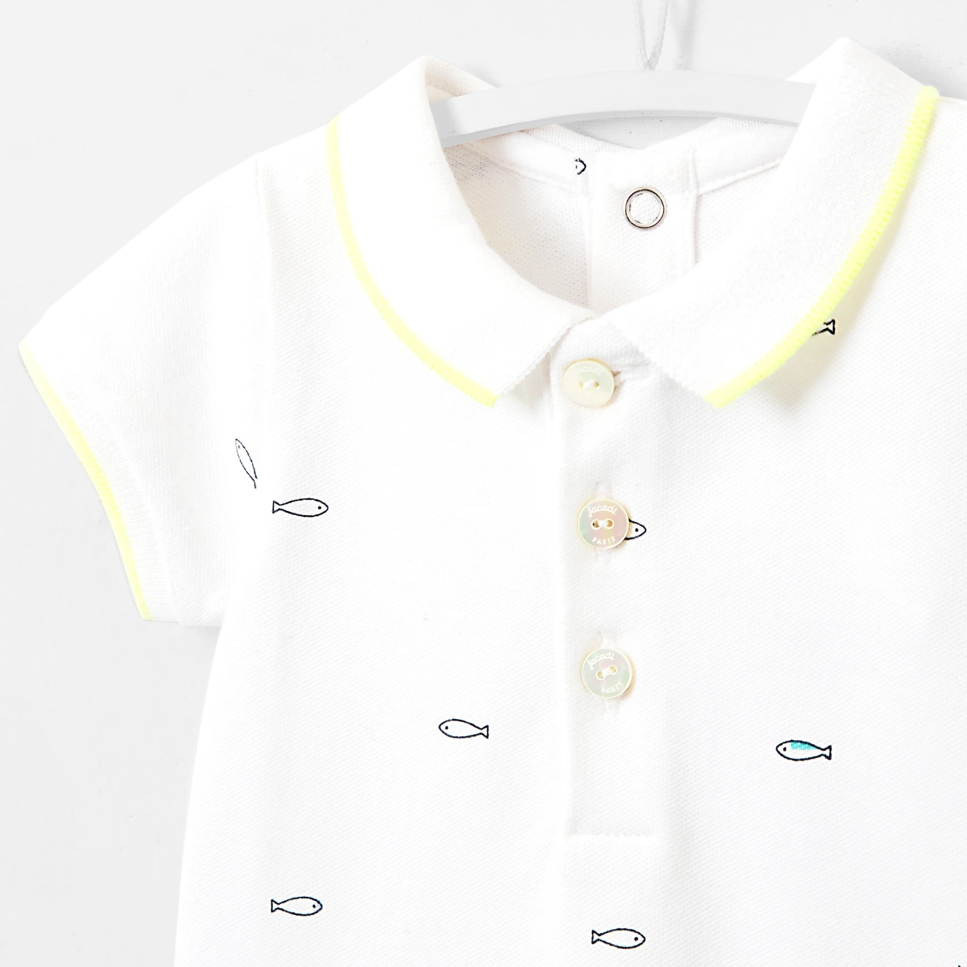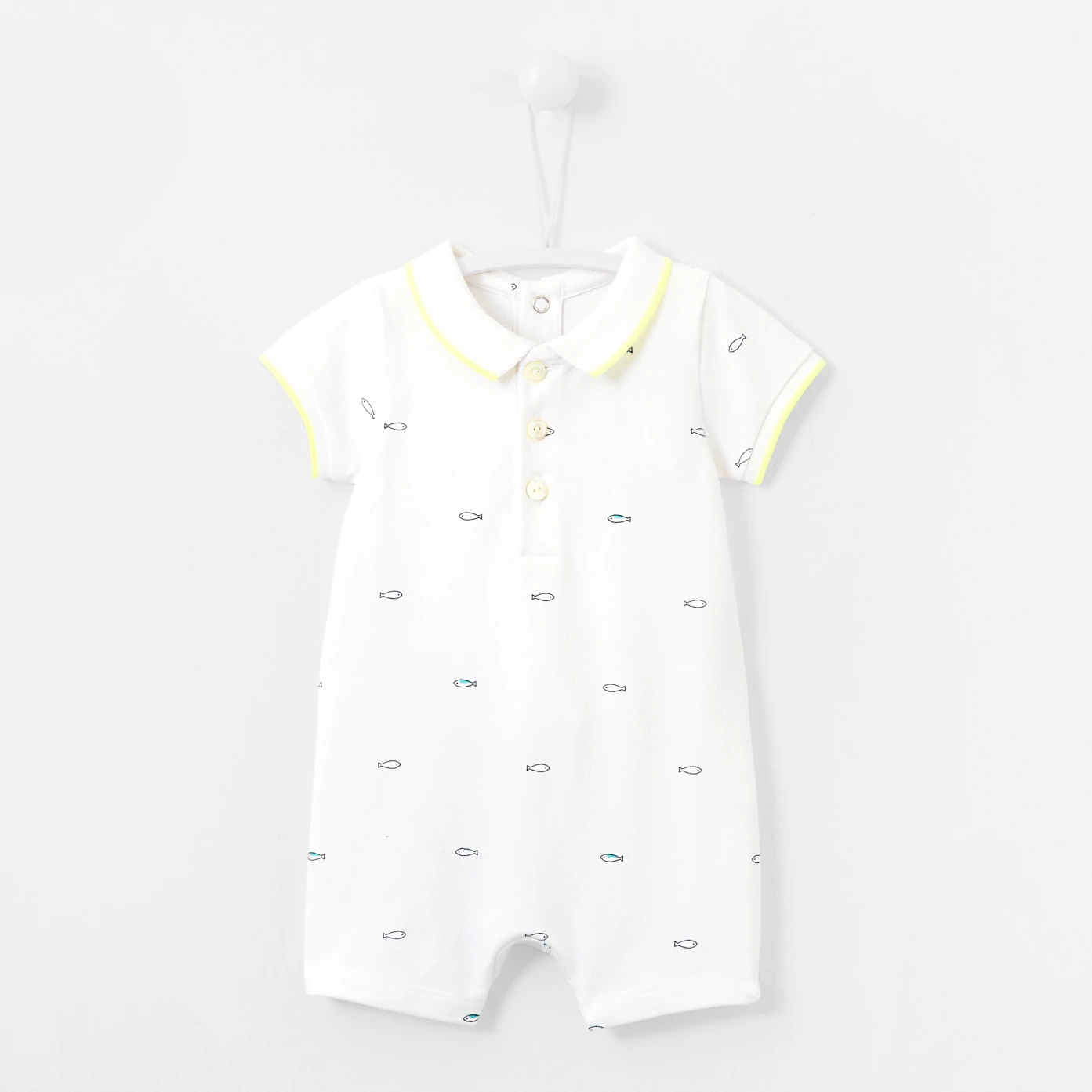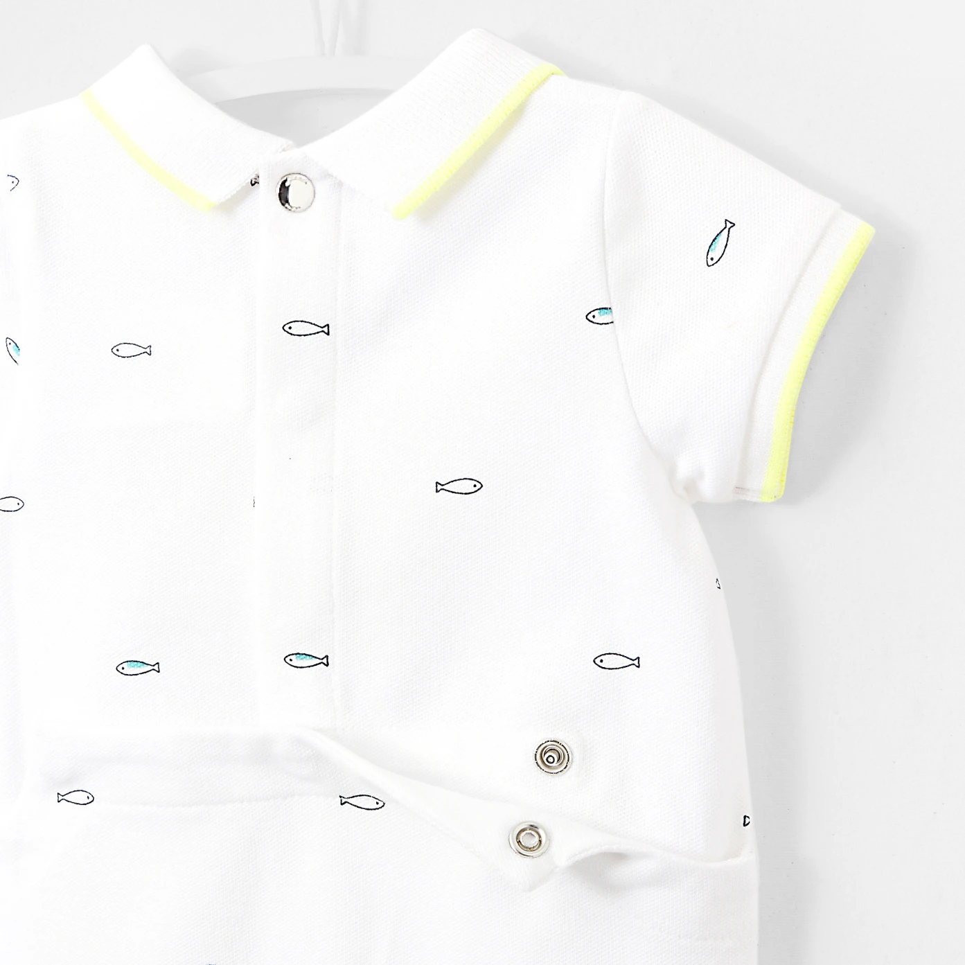 Mariage réussi entre un body et une combinaison, ce combishort pour bébé garçon se démarque par ses petits poissons évoluant sur un fond blanc en piqué de coton. Doté d'un col et de bas de manches animés d'un liseré jaune vitaminé apportant une touche sport chic au modèle, ce combishort de la collection Petite plage se ferme au dos et à l'entrejambe par pressions. Tout confort, il est idéal pour le quotidien de bébé.