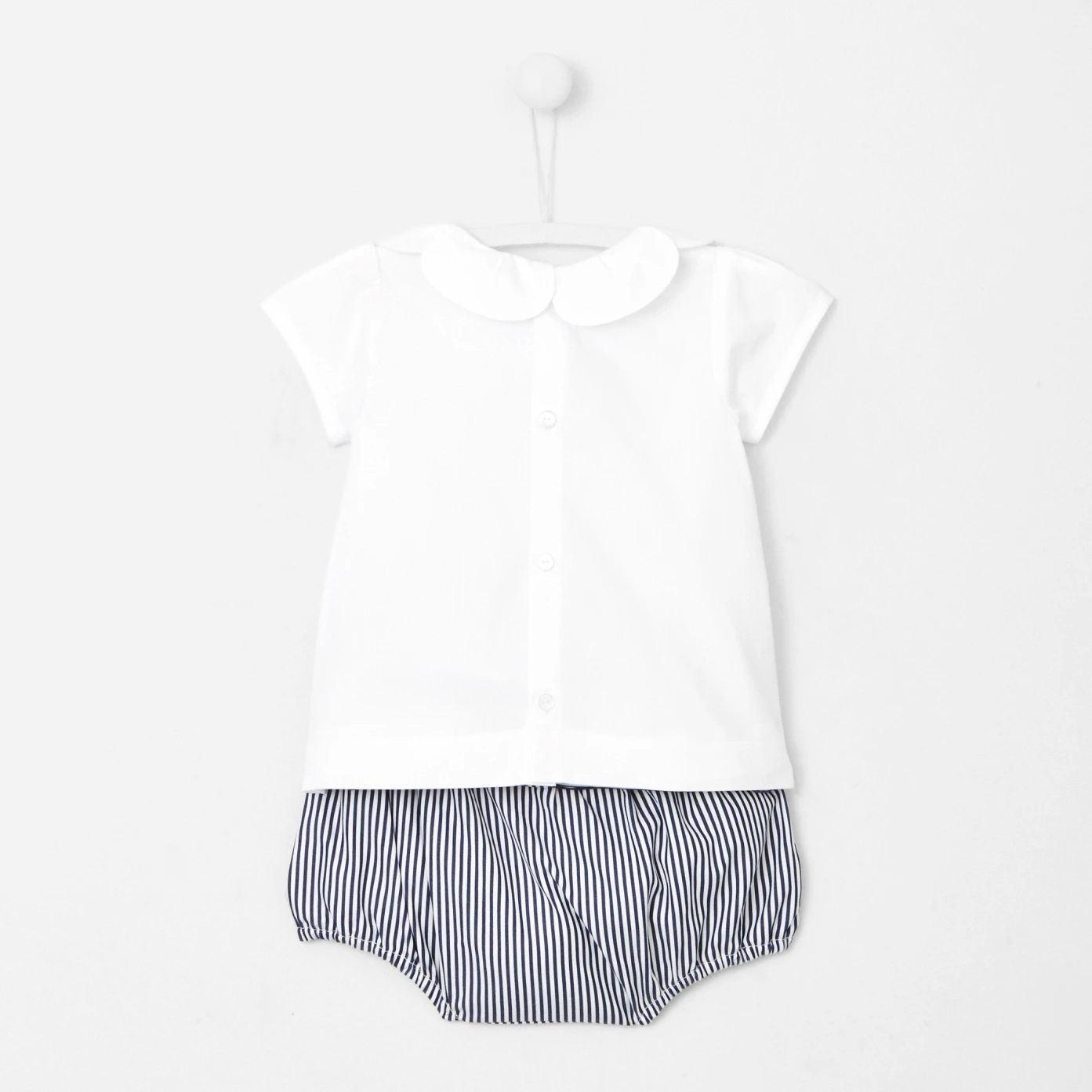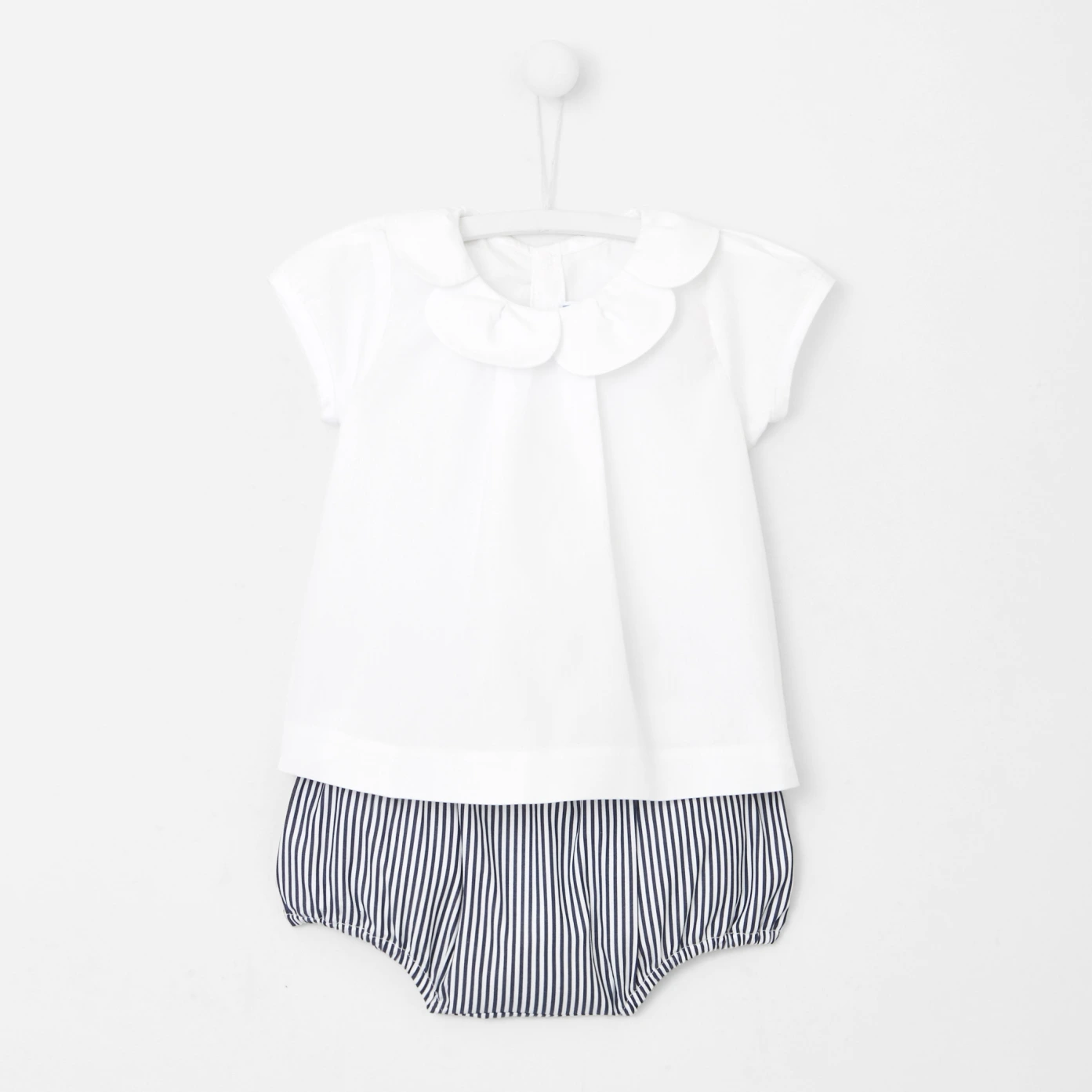 Souci du détail, savoir-faire et modernité sont réunis dans cet ensemble bébé fille. Idéal pour une cérémonie ou un événement spécial, cette tenue facile à vivre est absolument ravissante. Composé d'un haut en popeline de coton animé d'un col pétales s'ouvrant au dos par boutons en nacre naturelle et d'un short rayé à taille élastiquée sublimé d'un élégant noeud, cet ensemble du thème Petite noce sera parfait une fois associé à un cardigan.