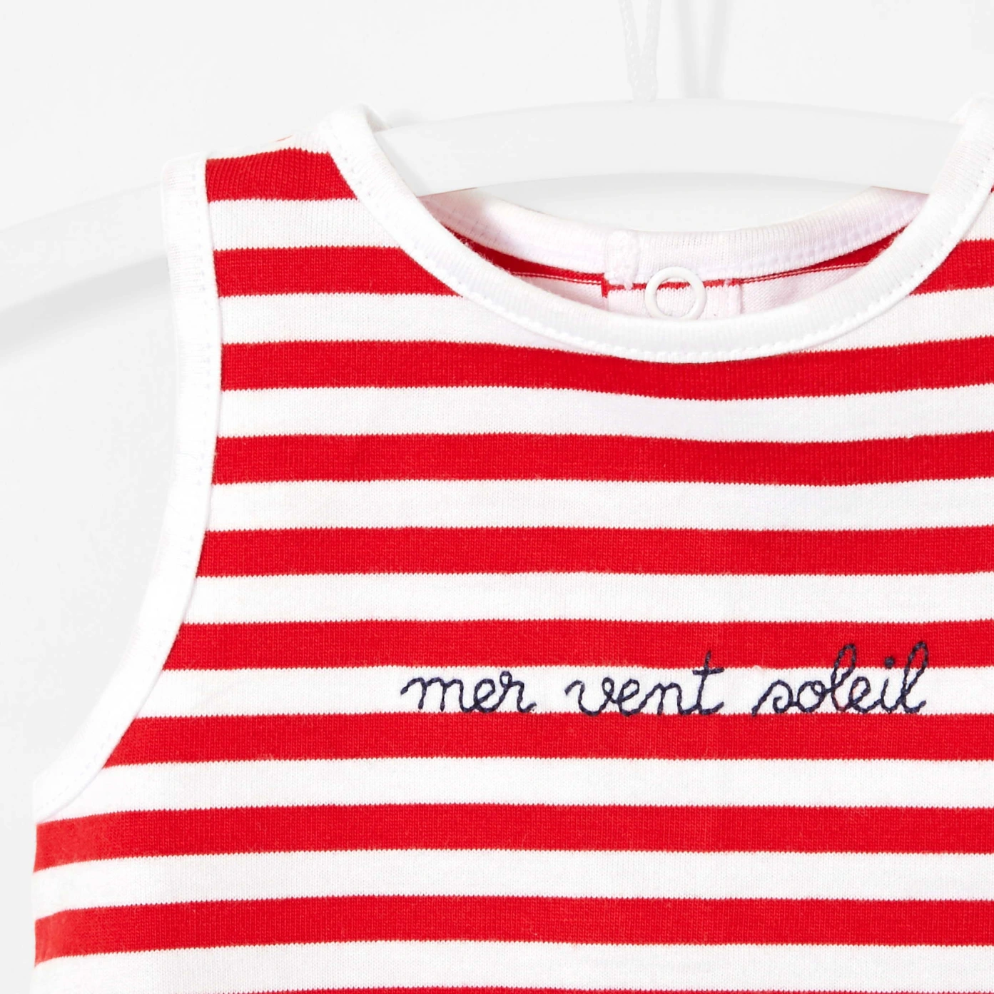 Idéal pour les premiers moments à la plage avec bébé, cet ensemble composé d'un t-shirt sans manches et d'un short élastiqué est parfait pour le plein été. Léger et facile à enfiler, le t-shirt s'ouvre par boutons-pression au dos.