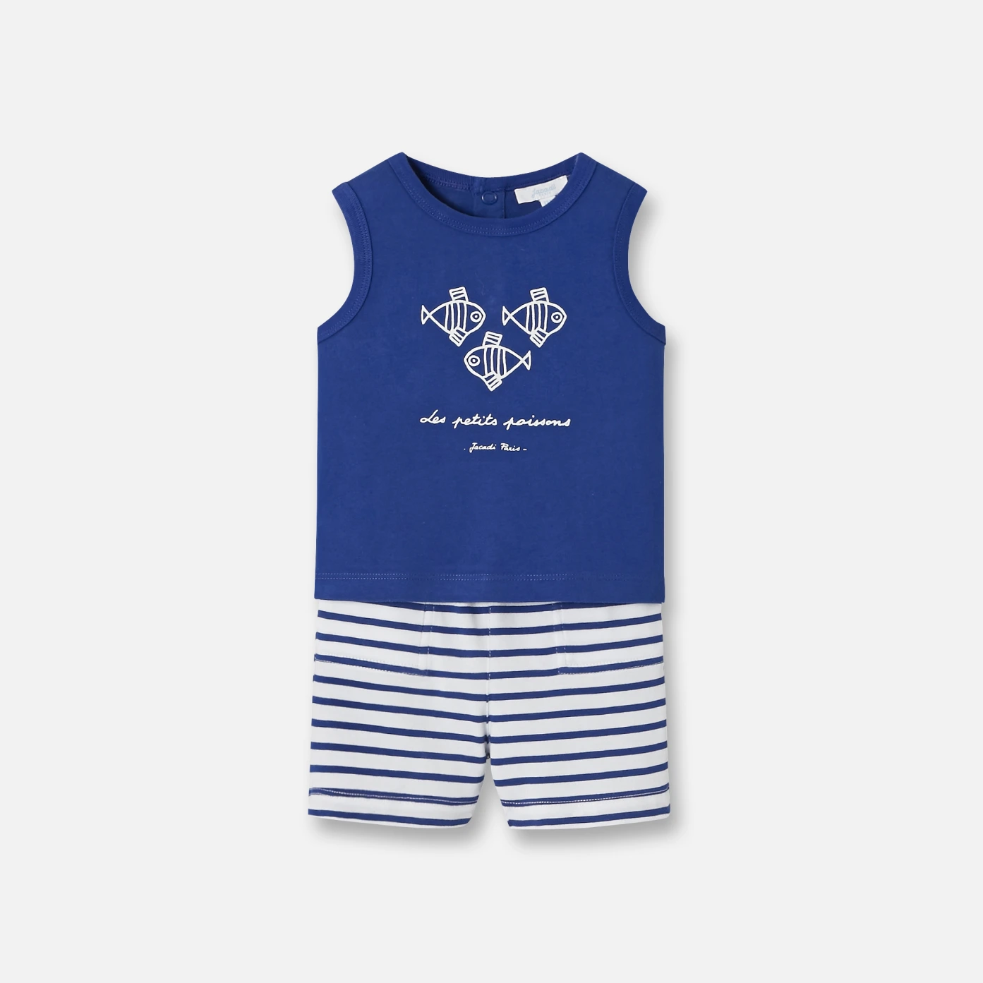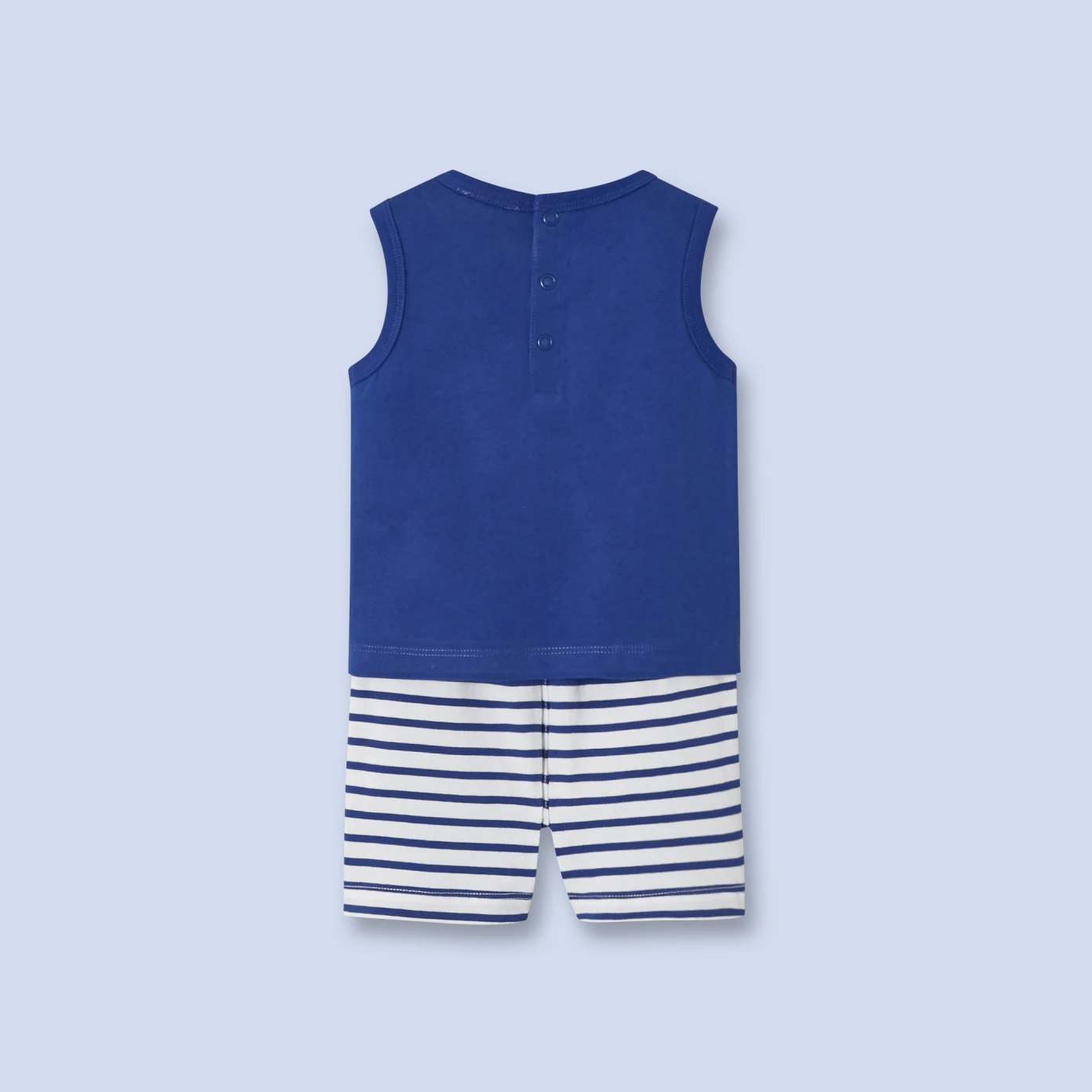 Pratique au quotidien, l'ensemble du tout-petit. Le débardeur sans manches est pressionné en haut du dos. Le short rayé dispose de poches. Taille élastiquée.
