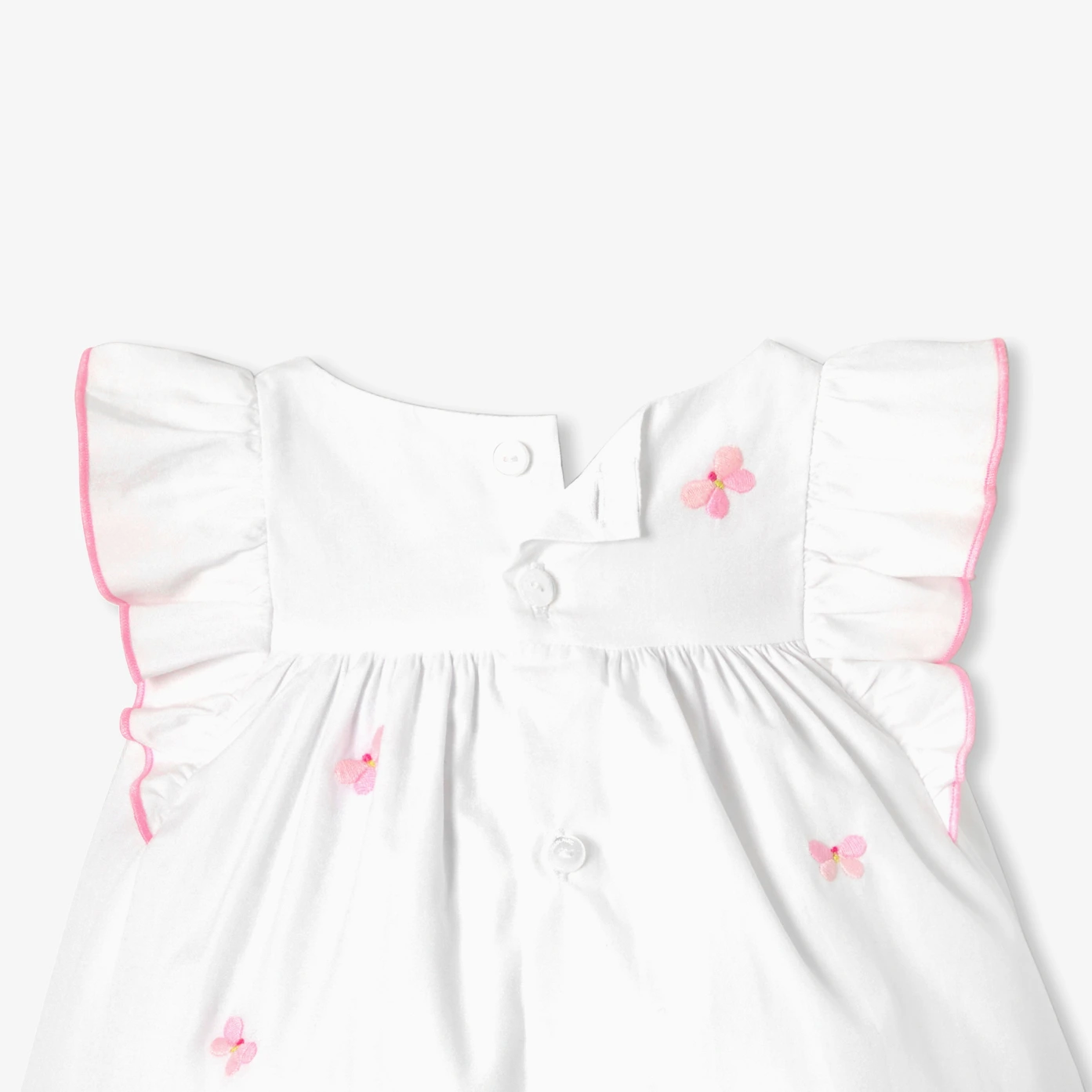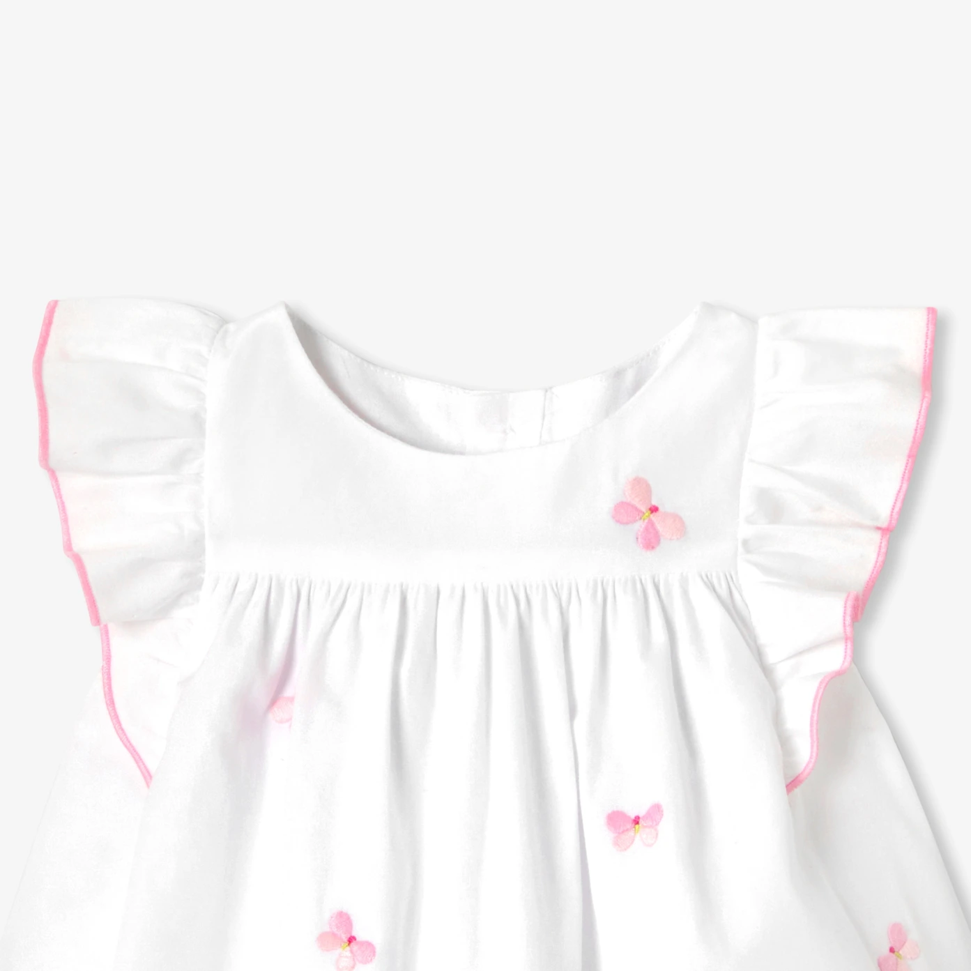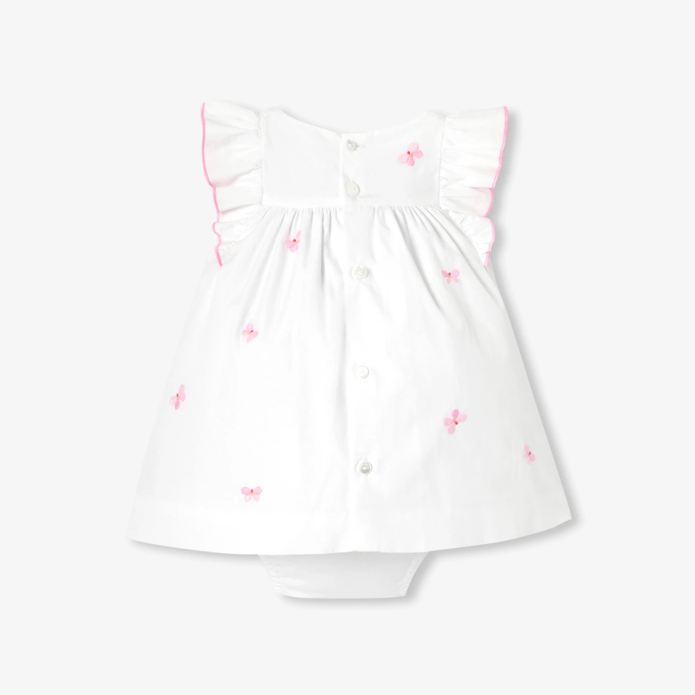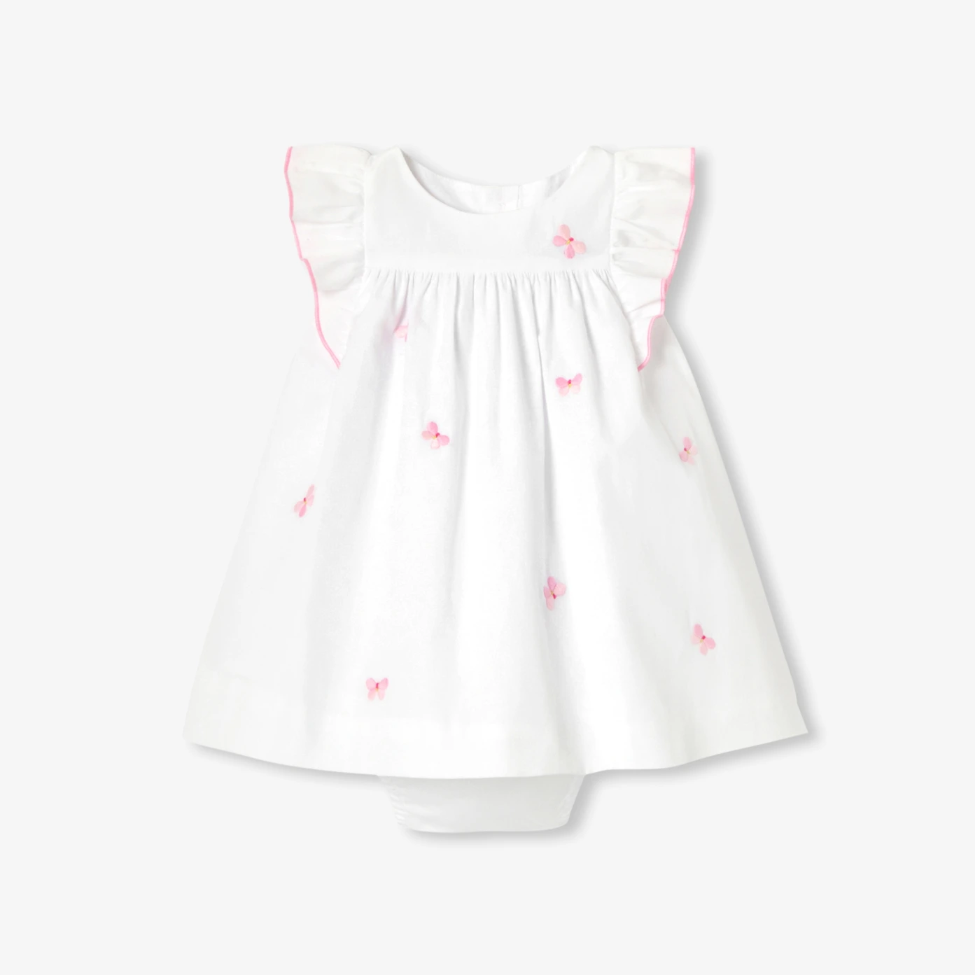 Ode au printemps, la robe bébé fille en popeline blanche se pare de papillons brodés pour une allure chic et romantique. Animée de volants aux épaules surlignés d’un bourdon rose et doublée pour plus de confort, elle s’ouvre au dos par de jolis boutons en nacre naturelle. Une pièce idéale pour les beaux jours et les moments précieux.- Robe bébé fille en popeline de coton- Épaules volantées à finition bourdon contrasté- Doublure en popeline- Papillons brodés- Ouverture au dos par boutons en nacre naturelle- Culotte à taille élastiquée assortie