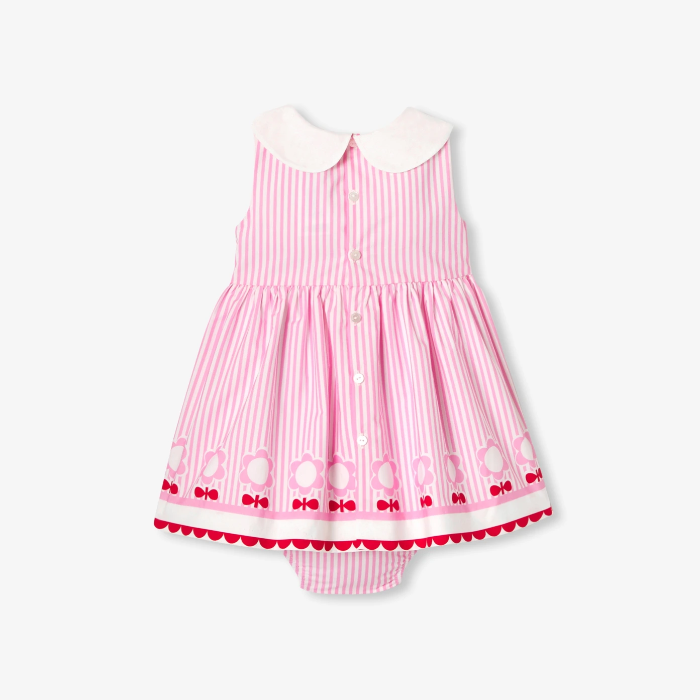Ode moderne à l’authenticité et au savoir-faire, cette robe bébé fille en popeline offre une plongée au cœur d’un univers graphique et floral. Sans manches et froncée à la taille pour une silhouette aérienne, elle se distingue par un jeu de rayures et un imprimé fleur placé en base pour un effet visuel inédit. Complétée d’une culotte assortie, cette création chic accompagnera avec élégance balades ensoleillées et cérémonies.- Robe sans manches bébé en popeline de coton biologique- Col Claudine en popeline - Rayures et frise florale en base- Découpe froncée à la taille- Ouverture boutonnée au dos- Culotte élastiquée assortie