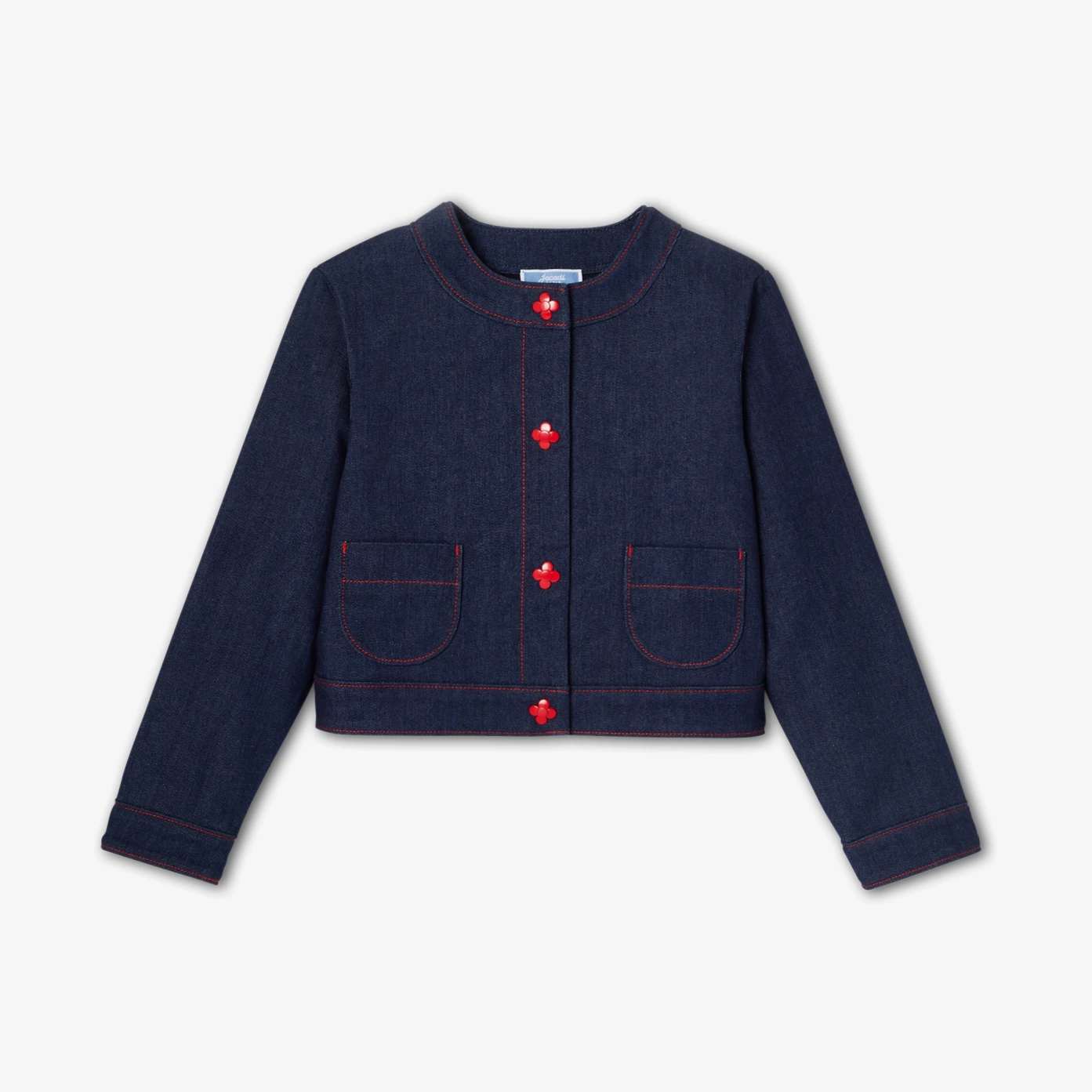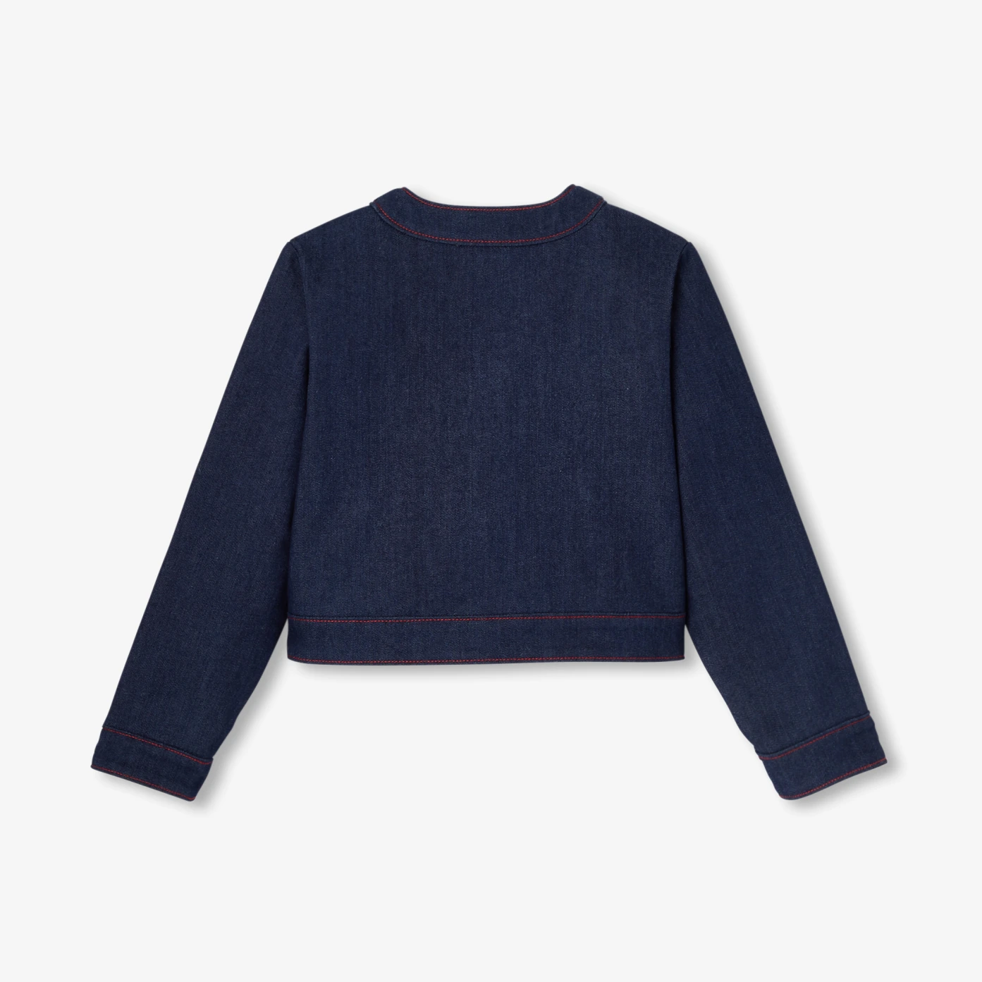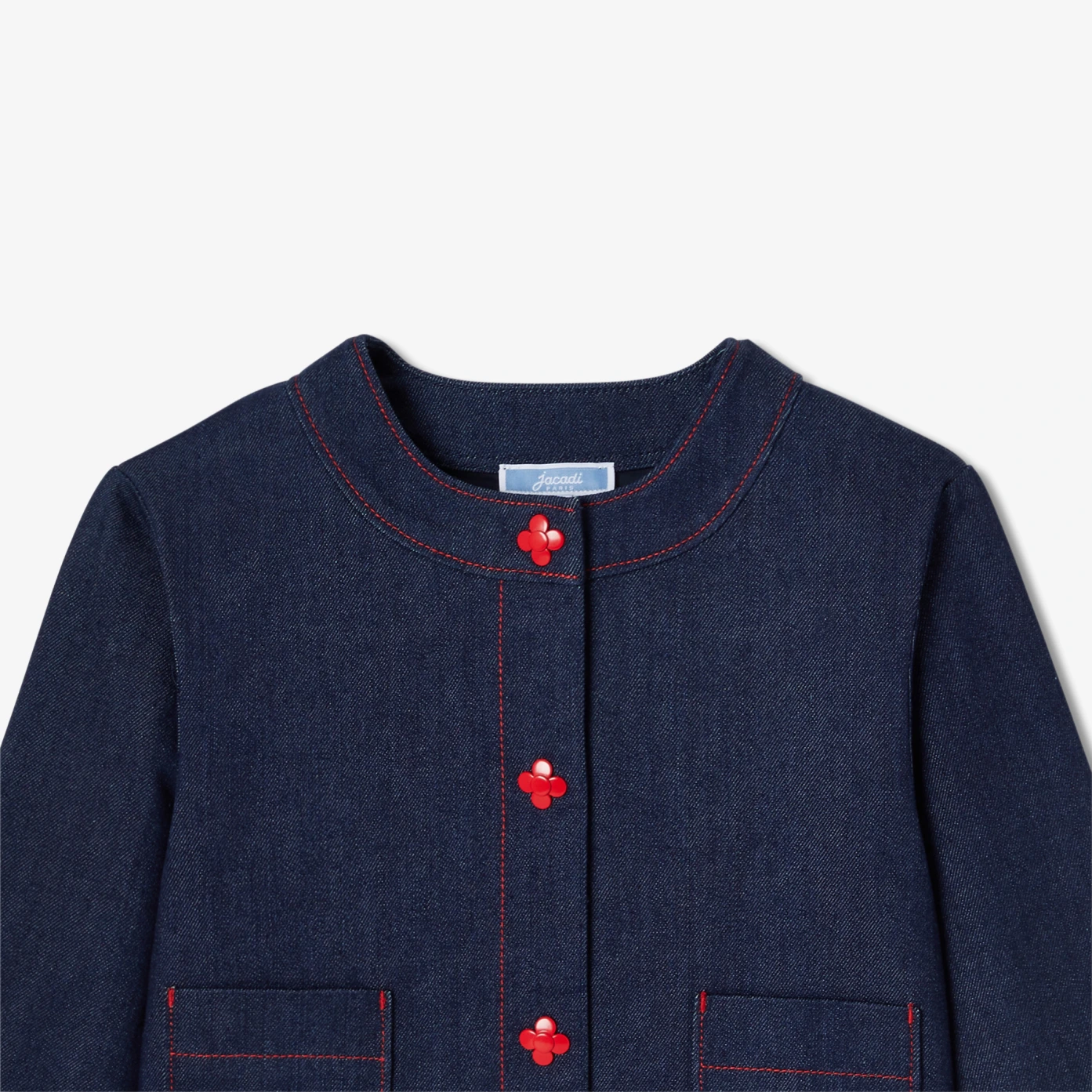 La veste en jean brut enfant fille revisite le vestiaire citadin avec une touche couture contemporaine. Coupe droite et col rond, surpiqûres rouges et boutons fleur subliment cette pièce résolument french touch à porter avec la robe ou le jean coordonnés.- Veste en jean brut coton biologique majoritaire- Col rond- Poches plaquées- Surpiqûres contrastées- Boutons en forme de fleur- Doublure en coton