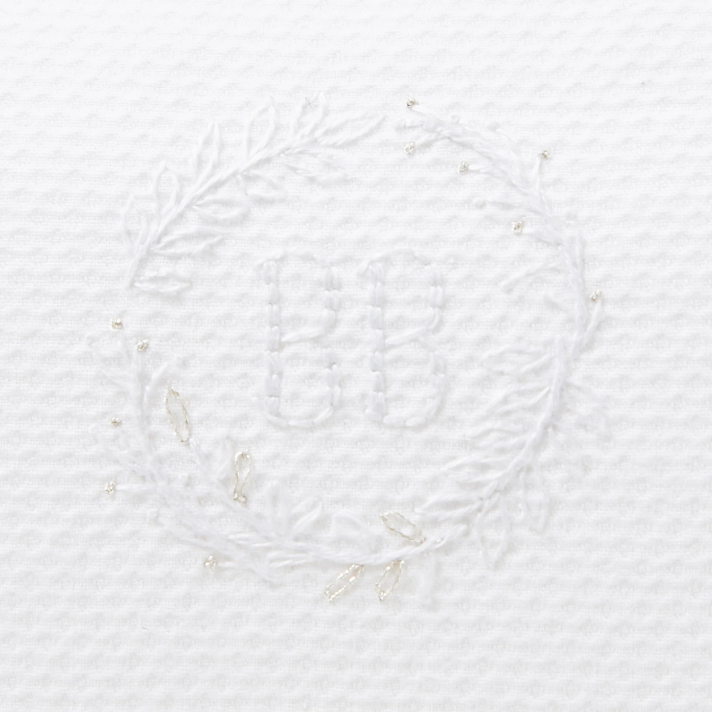 En piqué de coton et brodé à la main. Dimensions : 26 x 19 x 8 cm.