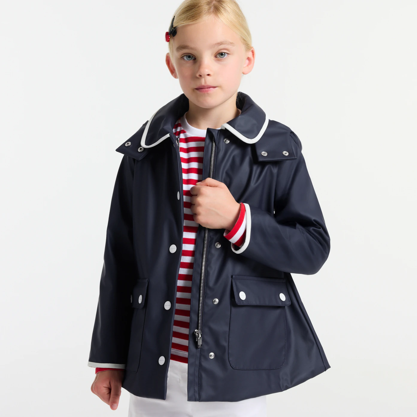 Retrouvez tout le chic français et l'ADN Jacadi infusés dans ce ciré enfant fille. Effet mat et surligné de biais contrastés autour du col et en bas de manches, il est doublé en jersey pour apporter un maximum de confort. Taillé pour les giboulées, les petites filles attendront avec impatience les jours de pluie.- Ciré imperméable déperlant- Doublure corps en jersey- Doublure manches en polyester- Capuche intégrée- Poches à rabat- Ouverture par zip et pressions