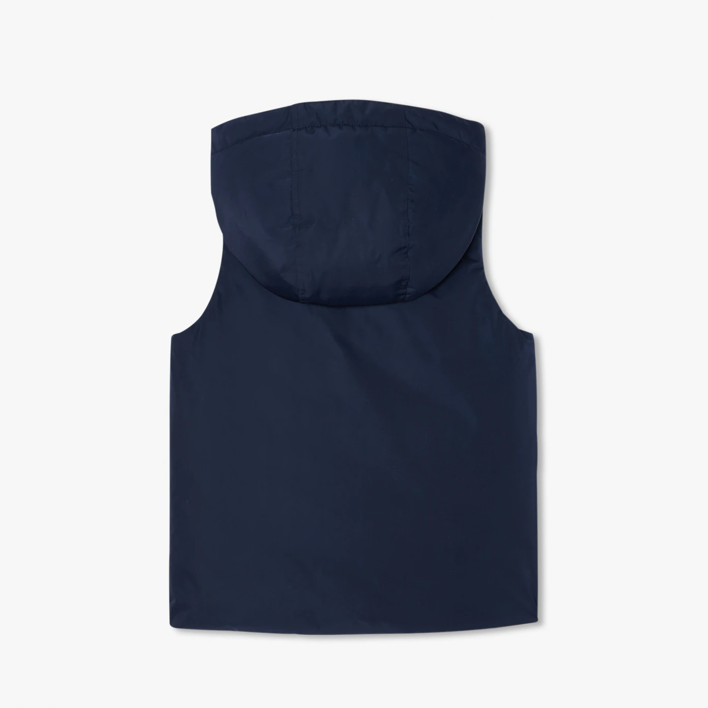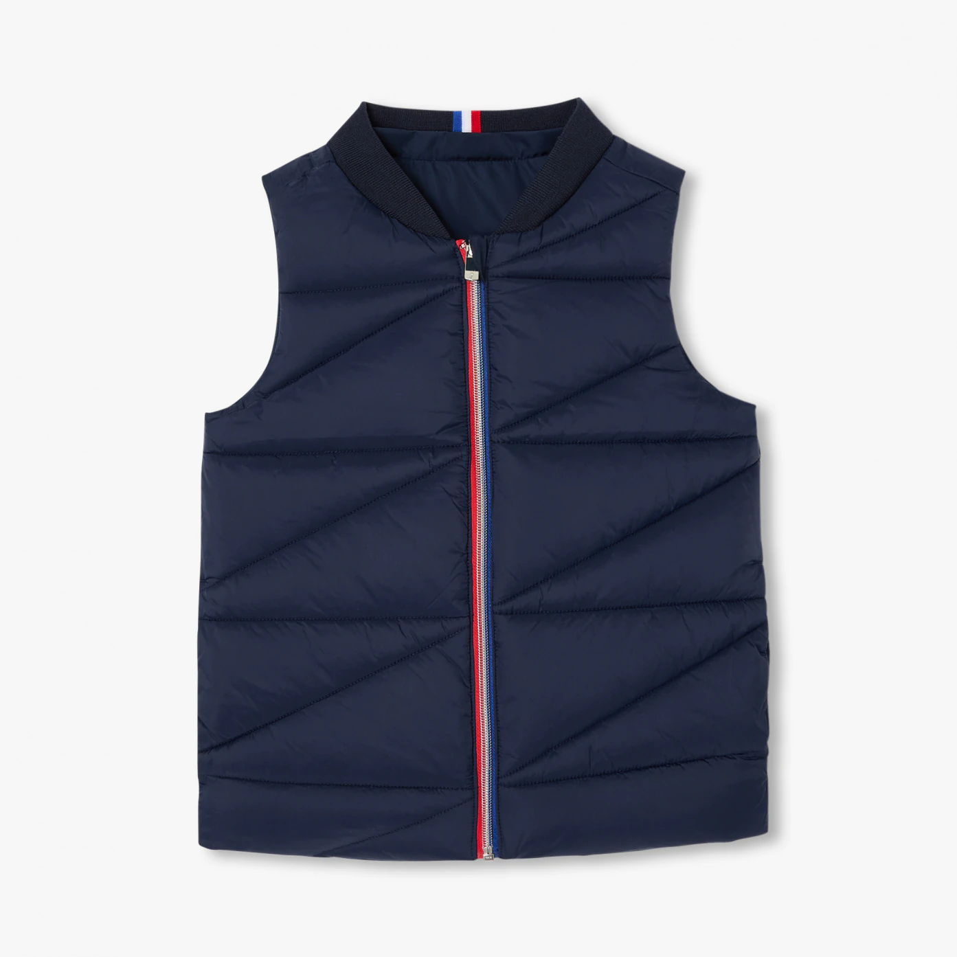 Coup double pour la doudoune sans manches enfant garçon. Moderne et ingénieuse grâce à sa fonction réversible, elle est déclinée en nylon déperlant très résistant et garnie en fibre recyclée Repreve. Dotée d'une capuche amovible, d'un col bord-côte à patch tricolore et d'un badge sur la poitrine pour un look french touch, cette doudoune chic et technique à porter face quiltée ou sans couture sera de toutes les sorties d'entrée de saison.- Doudoune sans manches poids plume- Nylon déperlant- Poches kangourou- Capuche amovible- Fermeture zippée- Garnissage en fibre recyclée Repreve