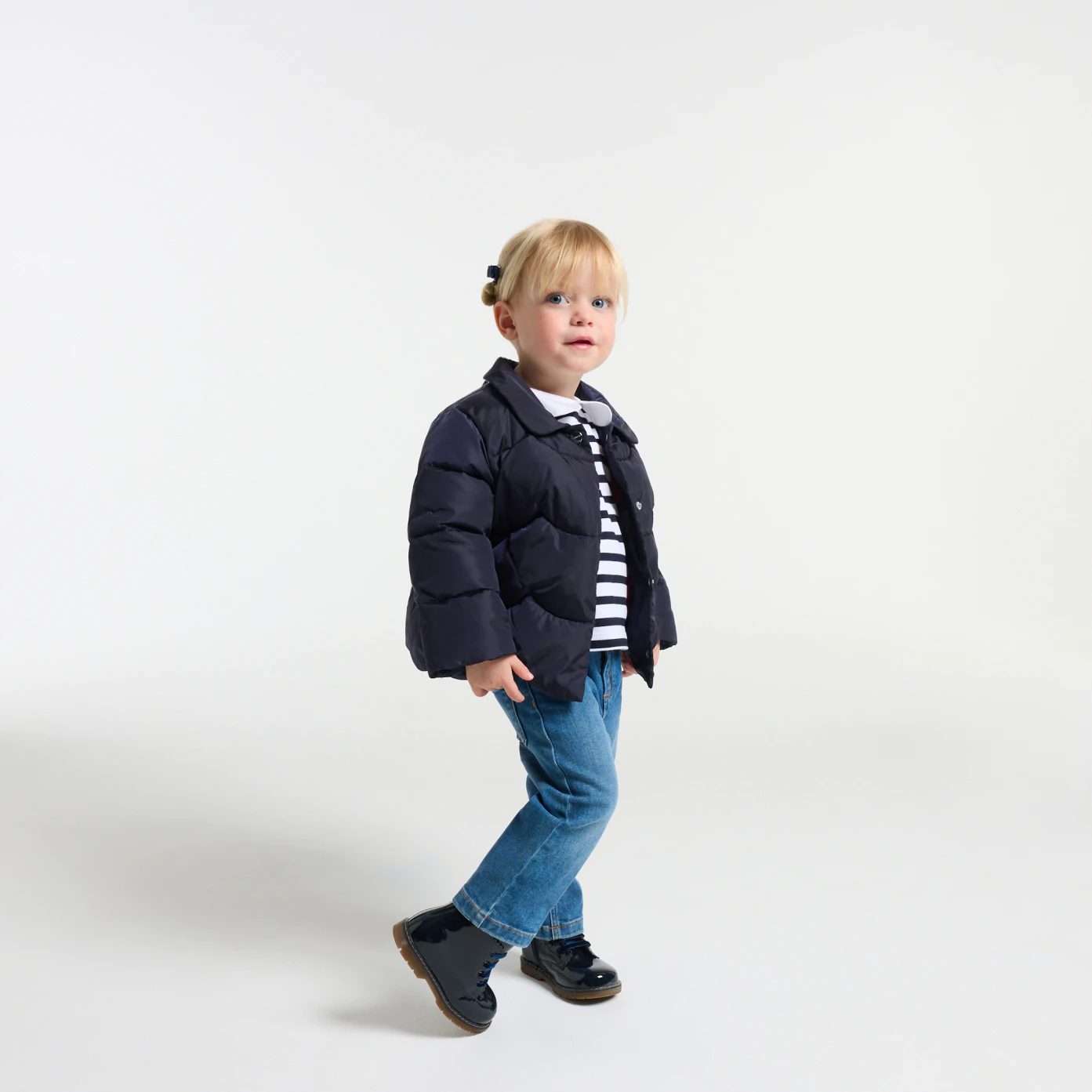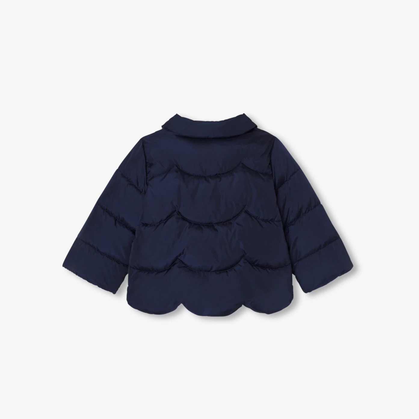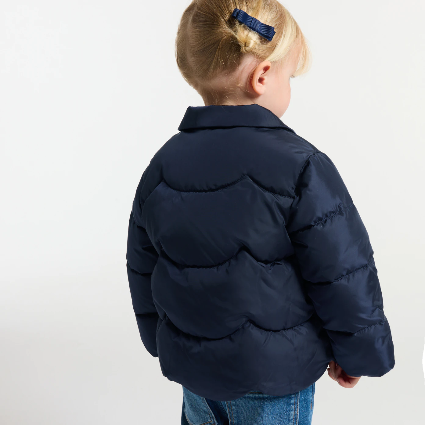 Toujours aussi couvrante et plus fine, les stylistes en retravaillé la coupe de la doudoune bébé fille pour en faire une pièce ultra-contemporaine. Déperlante et facile à enfiler grâce à son ouverture pressionnée, elle est sublimée d'un col Claudine et d'une base festonnée. Portée en balade et sur le chemin de la crèche, un essentiel du vestiaire à offrir pour la saison.- Doudoune fine bébé fille déperlante- Garnissage en polyester recyclé- Coupe légèrement plus courte- Col Claudine- Base festonnée- Ouverture pressionnéeTraitement déperlant permettant à l’eau de glisser en surface du vêtement. Il protège d’une pluie fine, mais n’empêche pas l’eau de traverser en cas d’exposition prolongée ou de forte pluie.