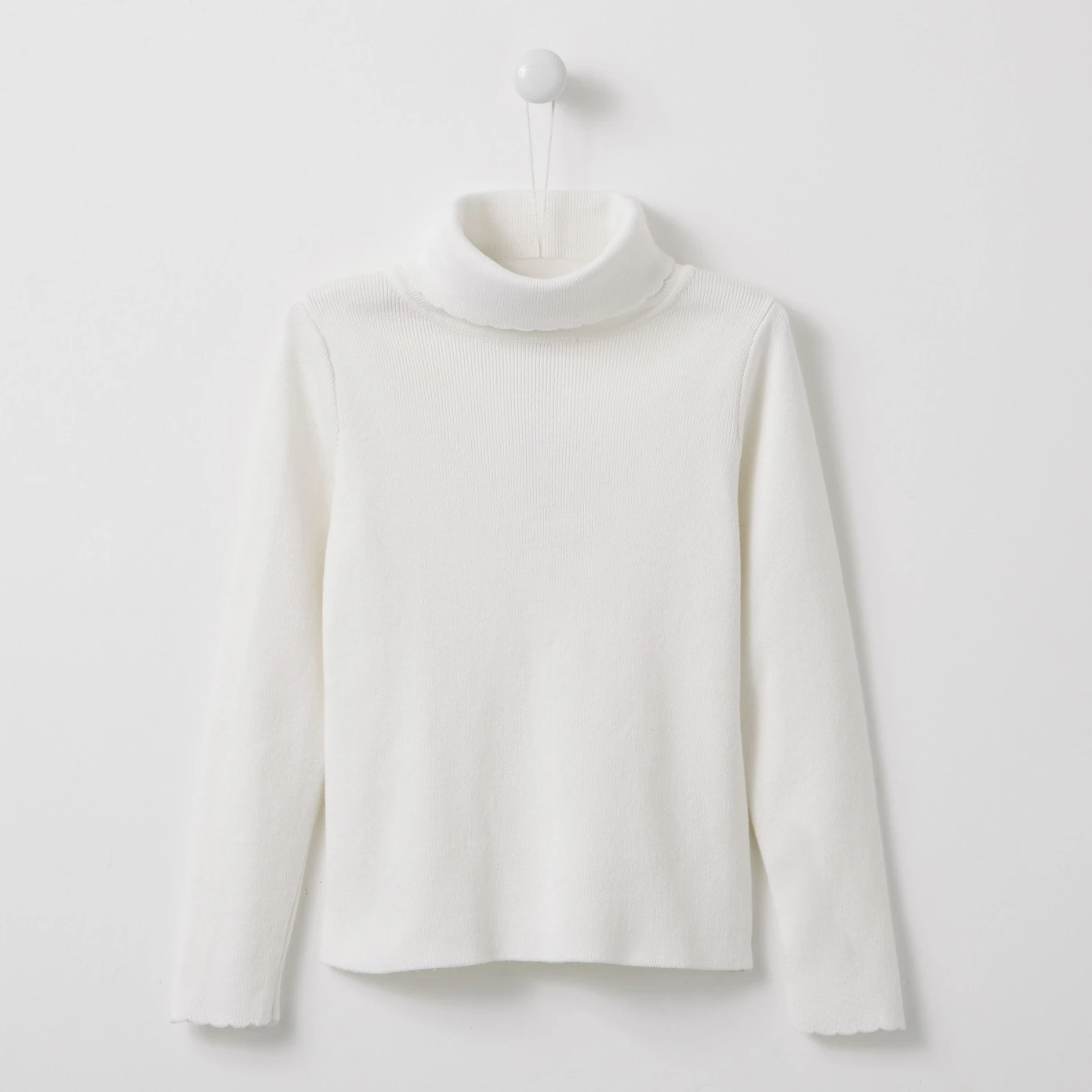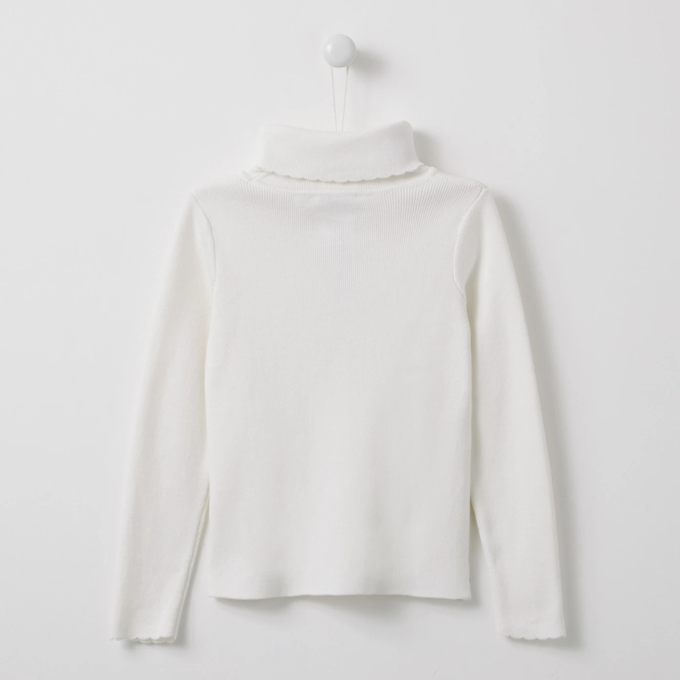 Pull chaussette en côte 1&1. Détail de festons au col.