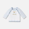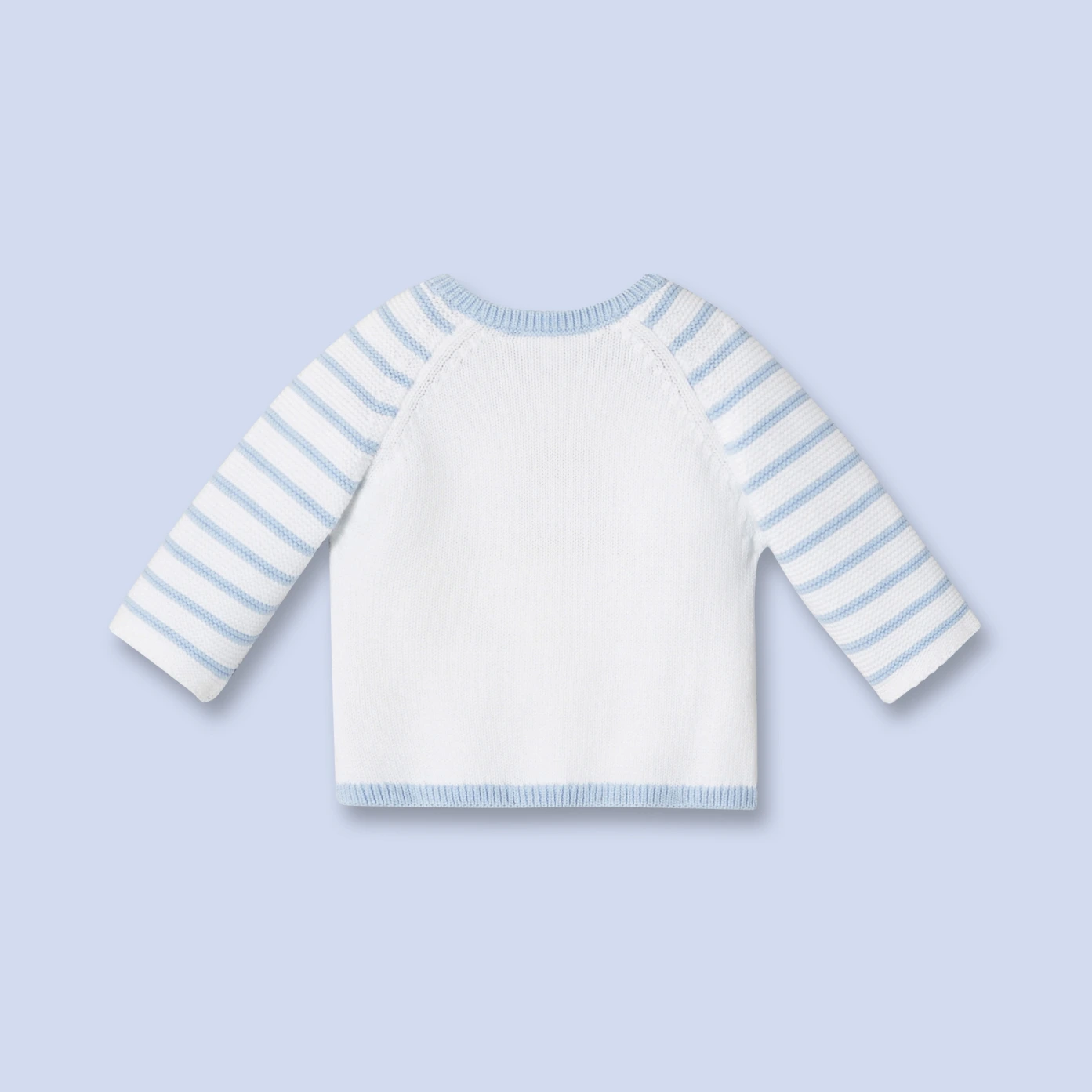 Candeur et élégance du pull en tricot du tout-petit. Détail de l'ourson devant. Le plus Jacadi : les boutons de nacre aux emmanchures.