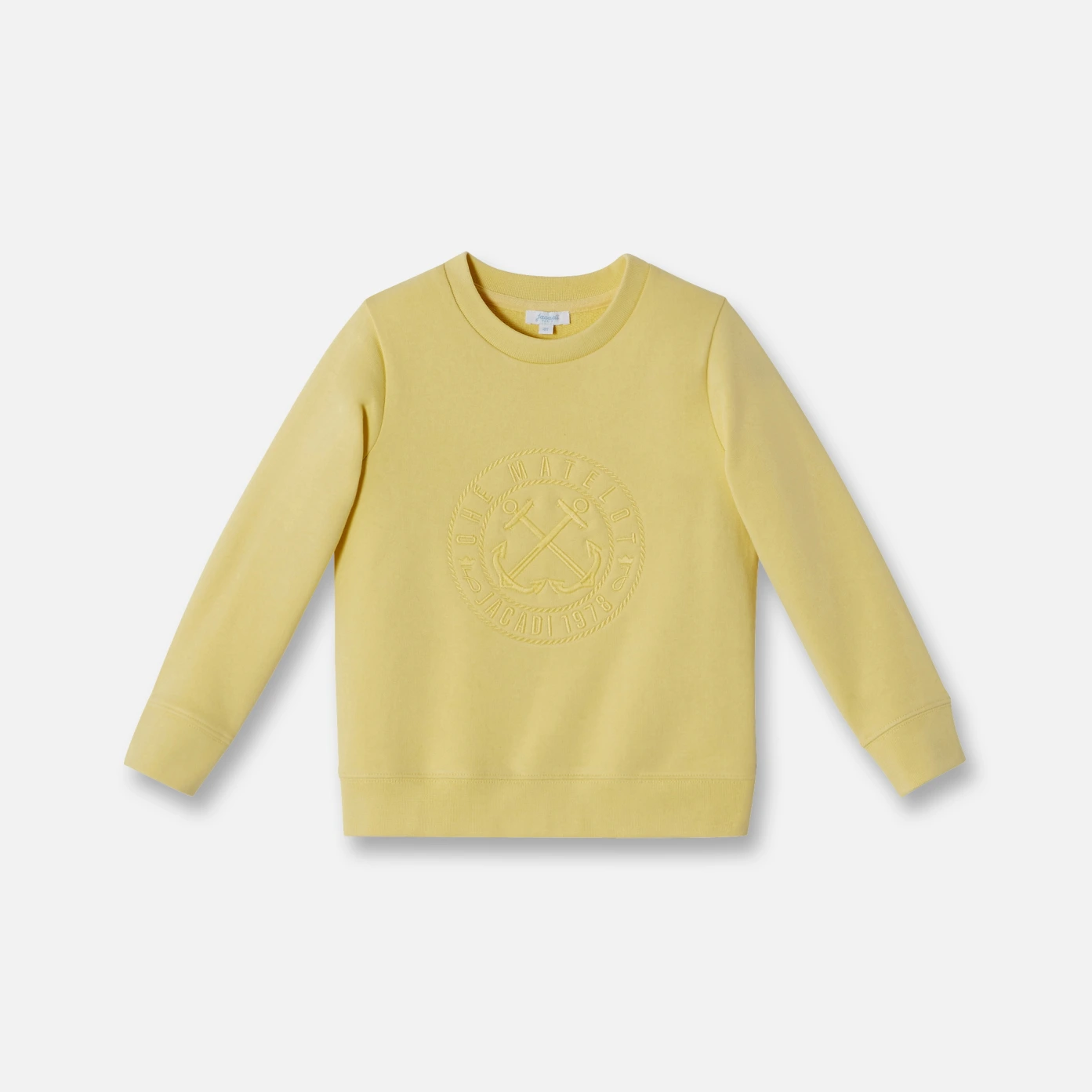 Esprit sport chic du sweat en molleton du petit garçon. Détail de l'écusson Jacadi devant.
