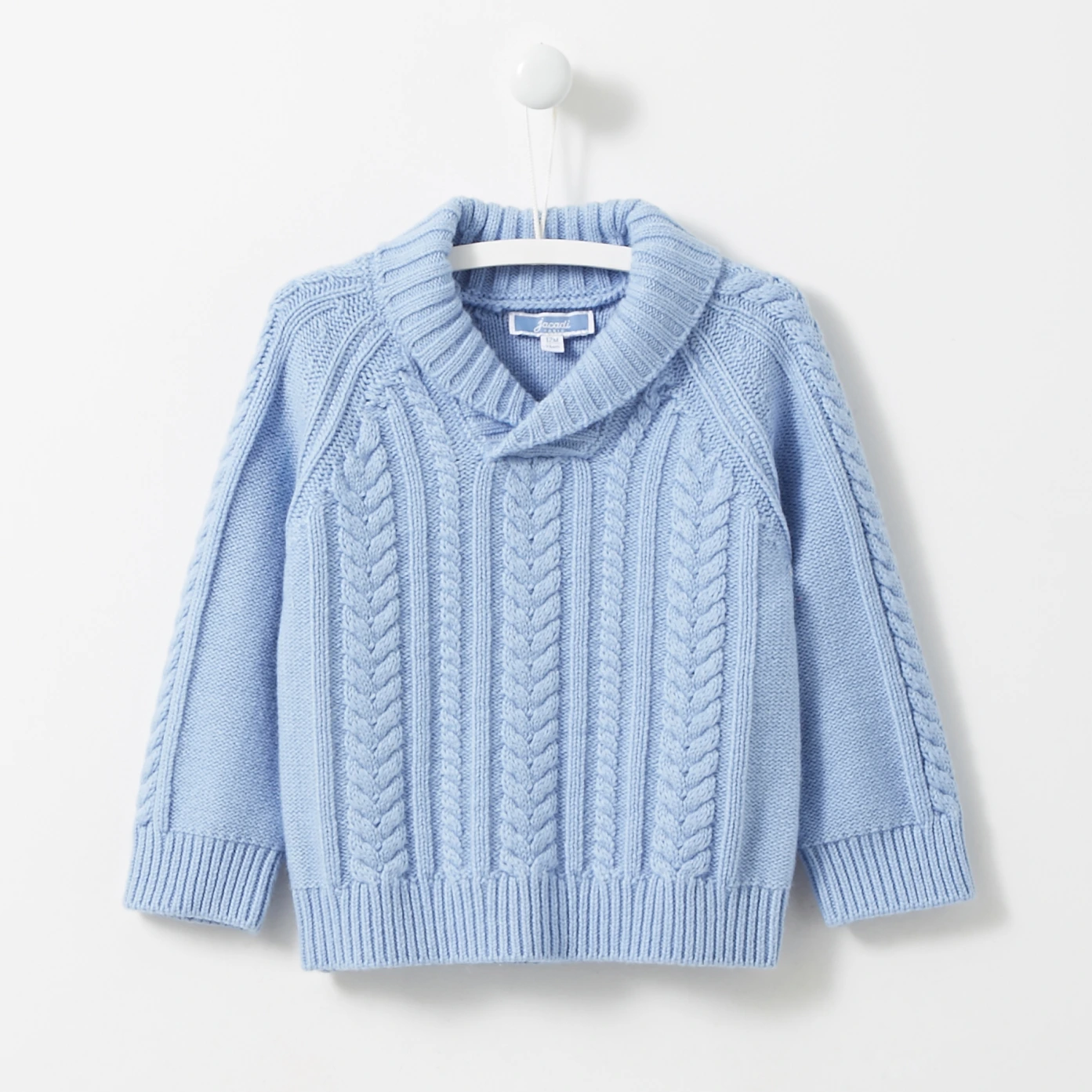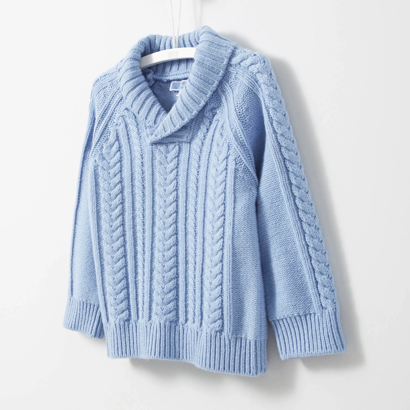 Pull torsades à col châle en tricot coton laine mélangés Détail chainette contrastée intérieur col