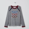 Pull en maille jersey, motif intarsia lunettes. Détail de fil doré