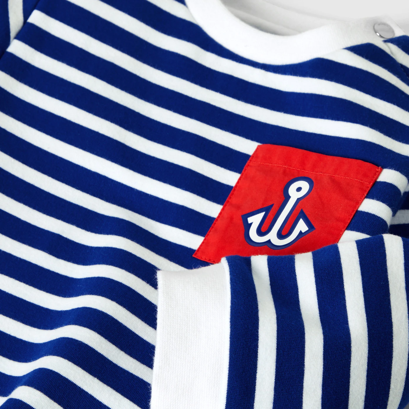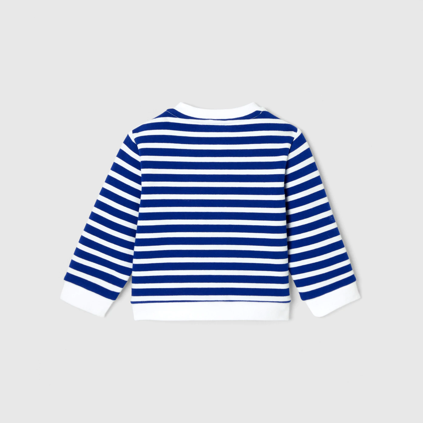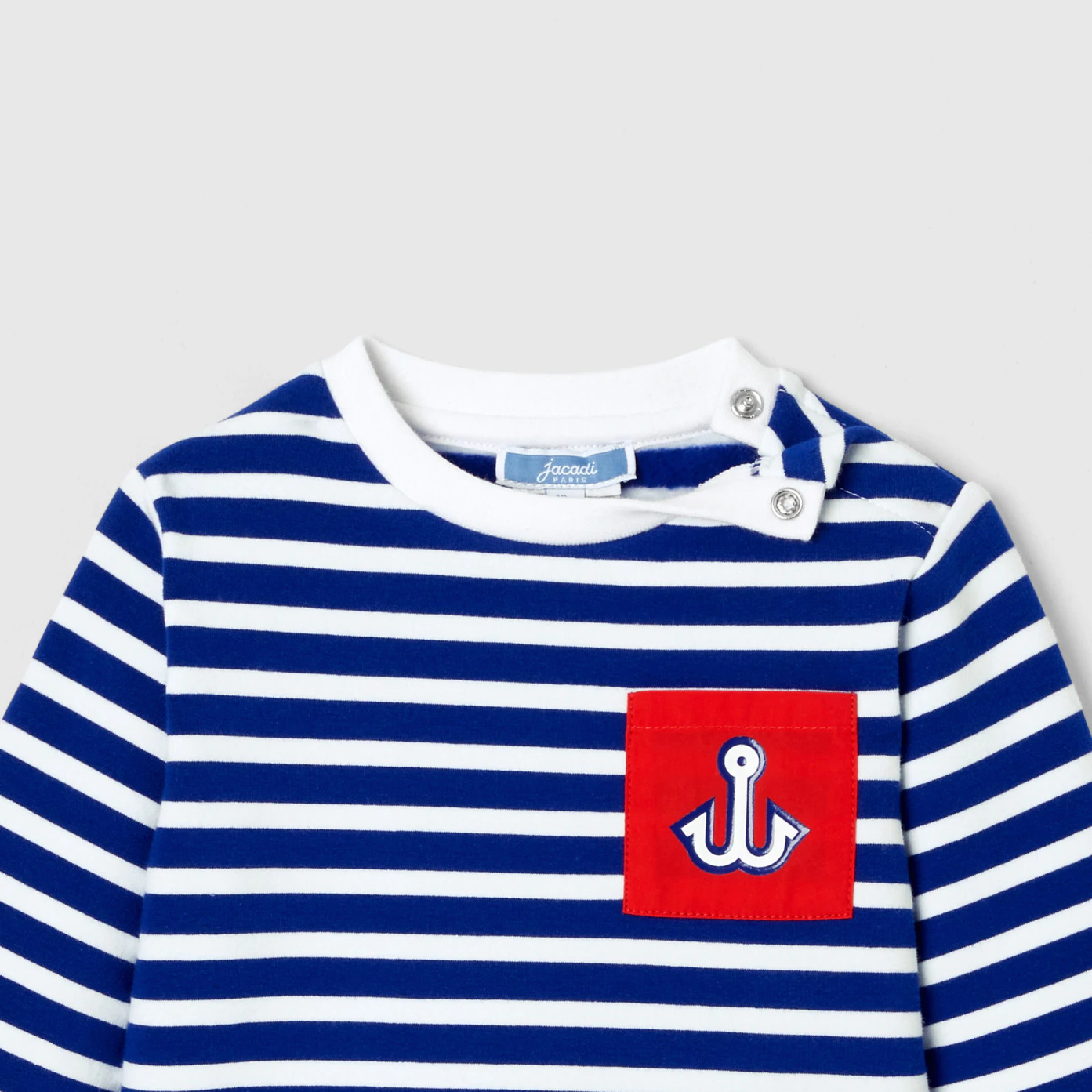 Décliné en molleton organique, le sweat bébé garçon s'inspire de la marinière. Accessoirisé d'une poche sur le plastron et pressionné à l'épaule pour faciliter l'habillage, accordez-le à un short et des baskets blanches pour les vacances.- Coton organique- Poche plaquée sur plastron- Pressions à l'épaule