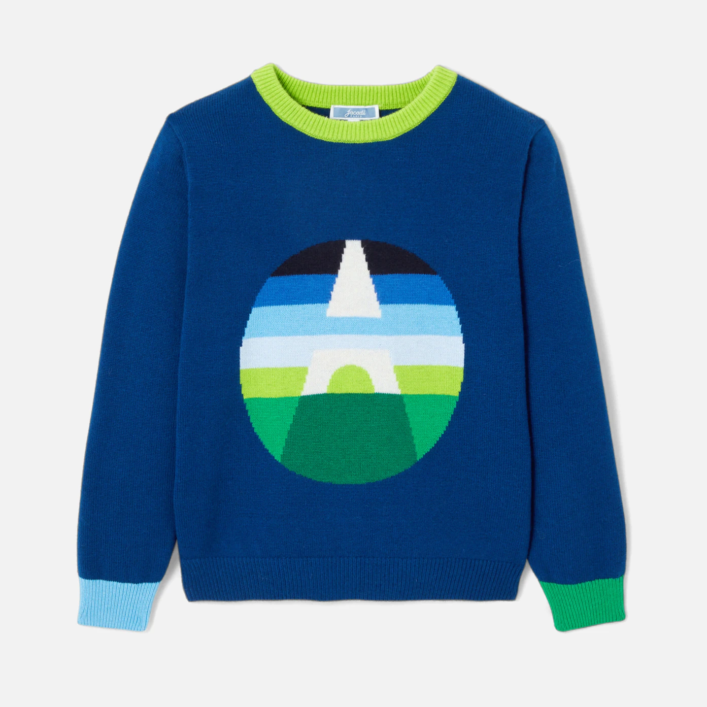 Un quotidien preppy chic et parisien avec cet élégant pull enfant garçon. En laine responsable et cachemire, intarsia Tour Eiffel et finitions contrastées dynamisent ce modèle à porter avec un pantalon en flanelle et un Teddy pour la rentrée.- Laine responsable et cachemire- Motif en intarsia- Col et bas de manches contrastés