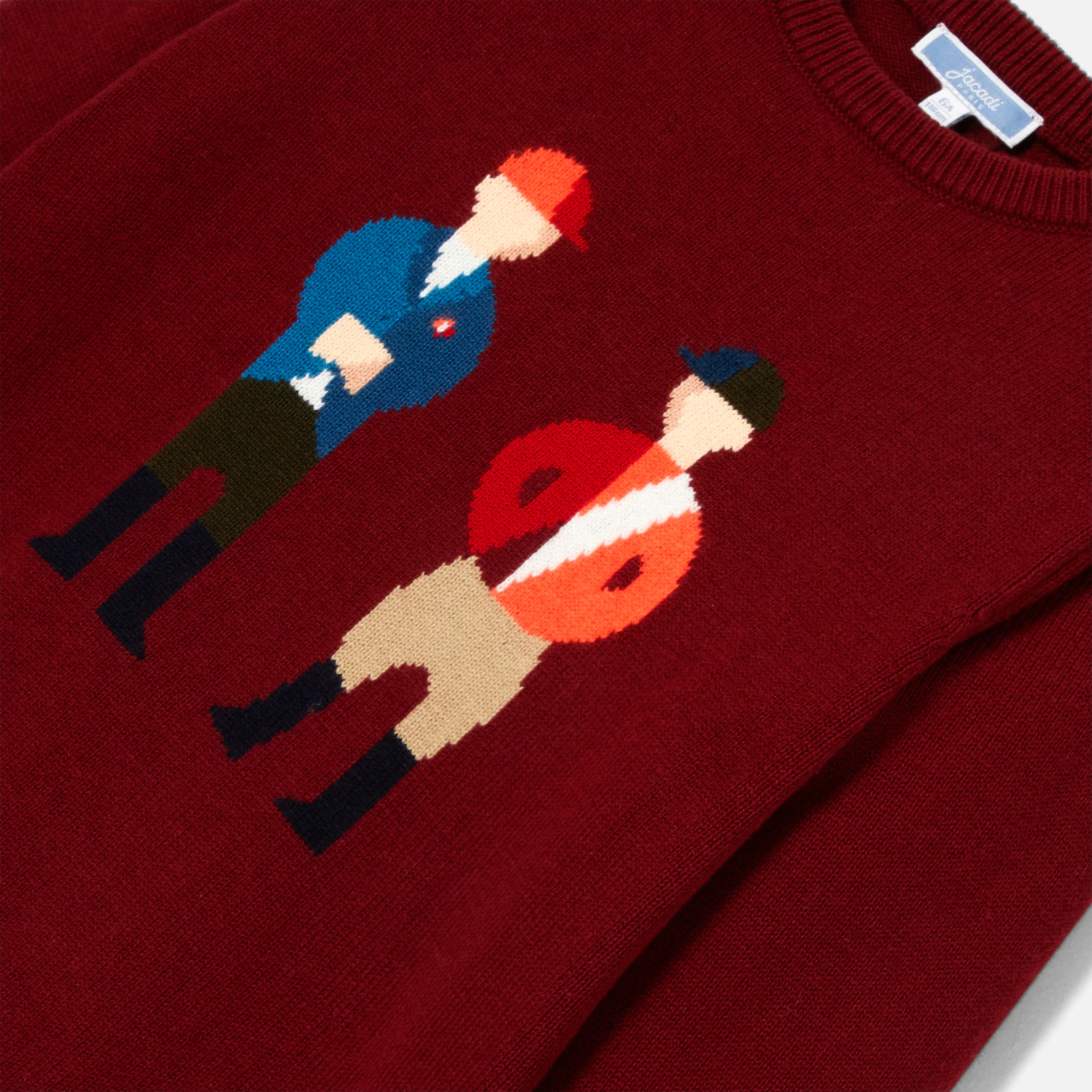 Pas besoin d'être apprenti cavalier pour aimer ce pull garçon. En coton biologique et laine responsable, il s'inspire de l'univers des courses équestres avec son intarsia dessinant deux jockeys. Doux et cosy, cet indispensable d'entrée de saison s'accordera facilement à un pantalon en velours et des bottines pour un quotidien chic décontracté.- Coton biologique et laine responsable- Intarsia jockeys