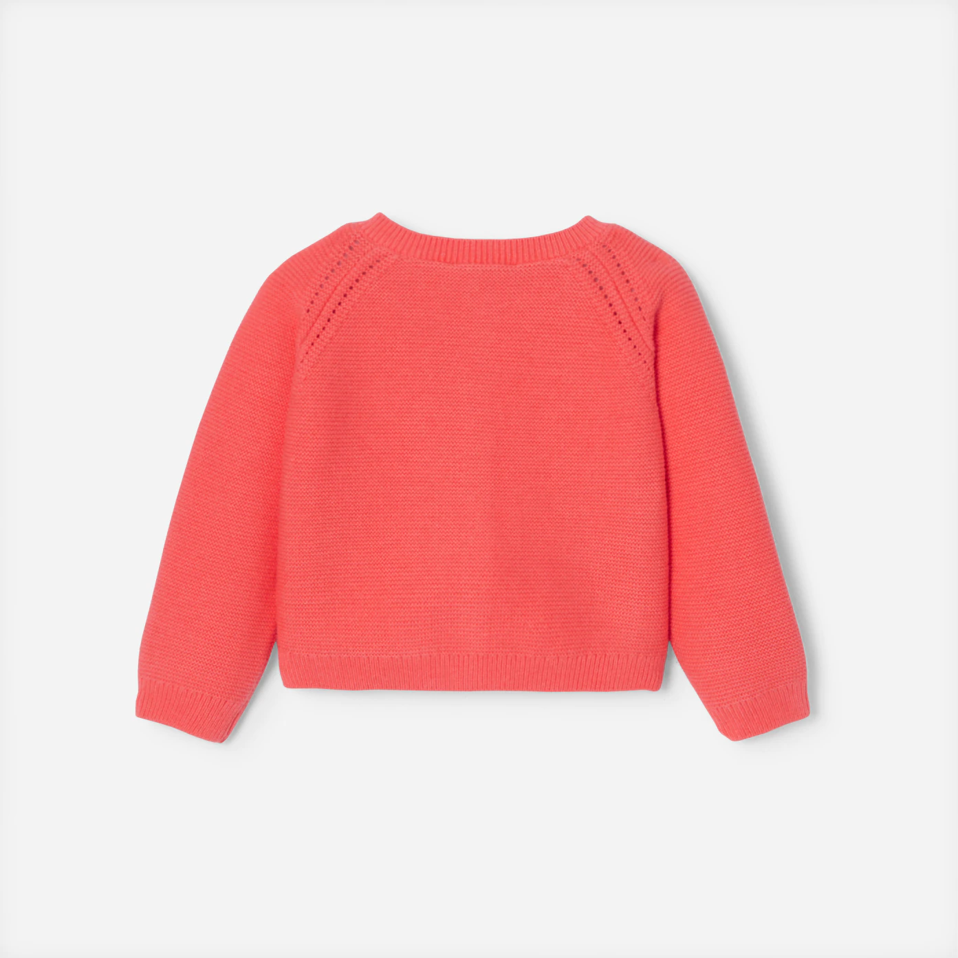 Une palette colorée qui fait pétiller la collection bébé fille avec ce gilet. En point jersey, manches raglan et détails ajourés finalisent ce gilet boutonné à porter sur une robe ou un t-shirt.- Cardigan bébé fille en point jersey- Manches raglan- Détails ajourés- Ouverture boutonnée