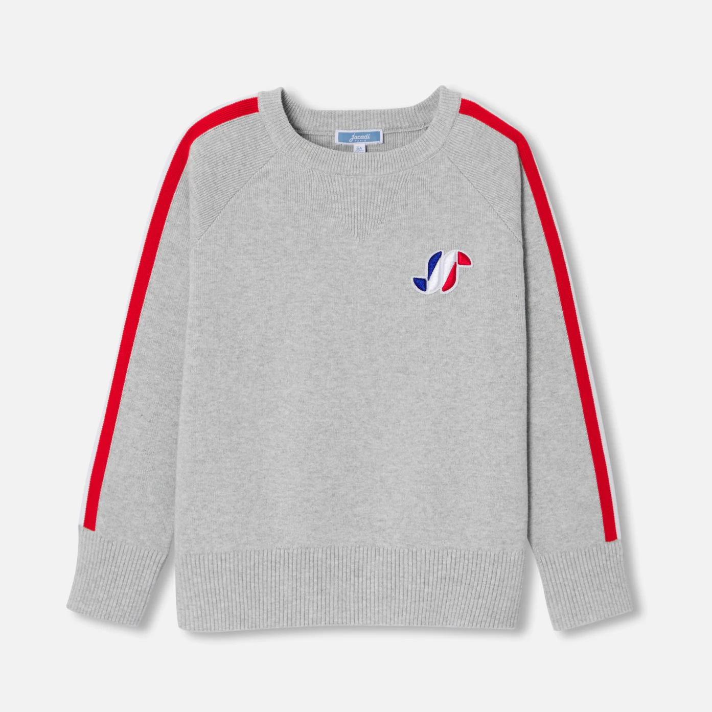 Le classique pull enfant garçon, s'inspire de la coupe sportswear du sweat pour un look plus urbain. En coton biologique doux et couvrant, col sweater, rayures en intarsia sur les manches et badge sur le plastron dynamisent ce modèle coup de cœur à accorder à un jean retroussé et des baskets pour une silhouette au charme parisien.- Pull garçon en coton biologique- Col sweater avec modestie- Rayures en intarsia sur les manches- Badge JP sur poitrine