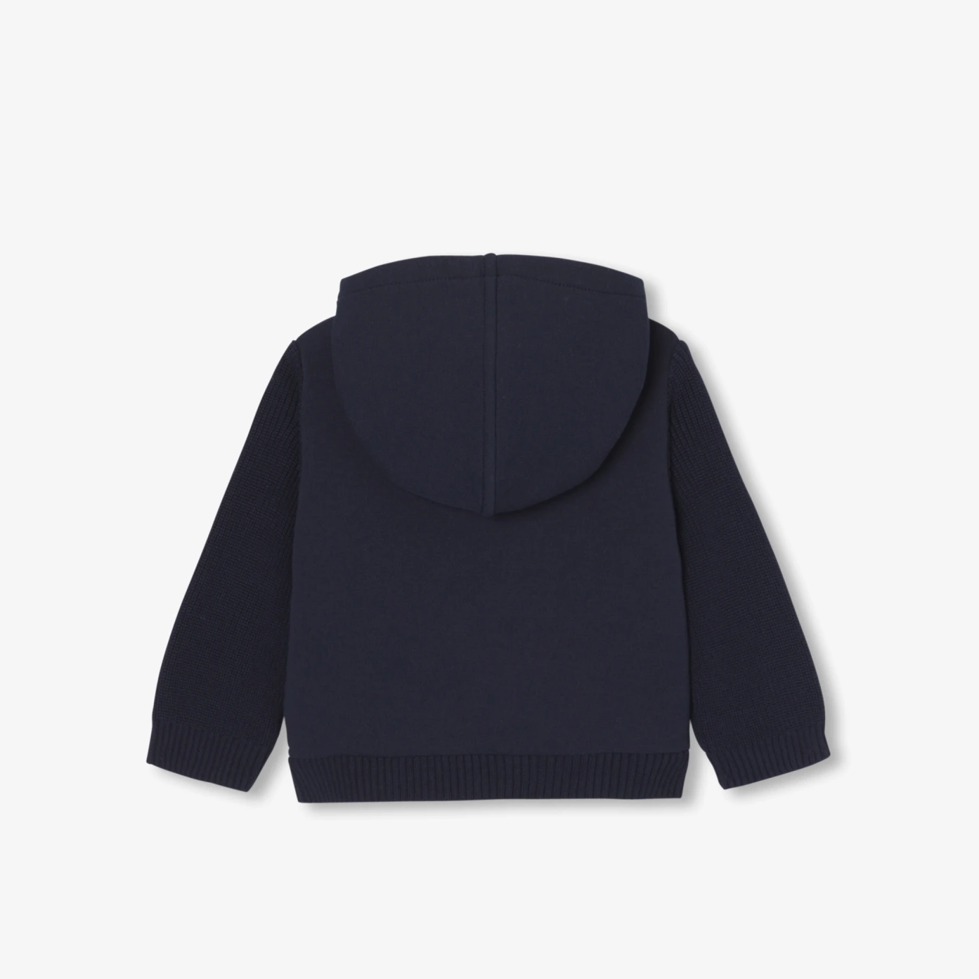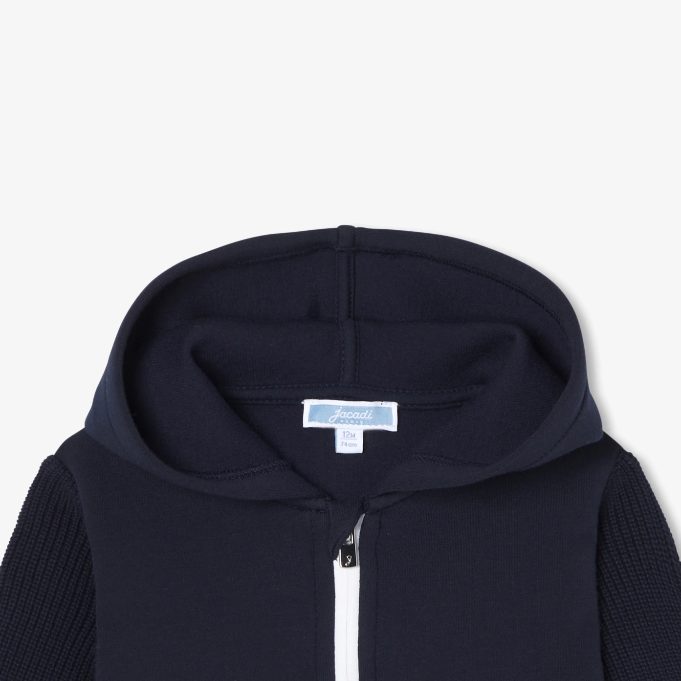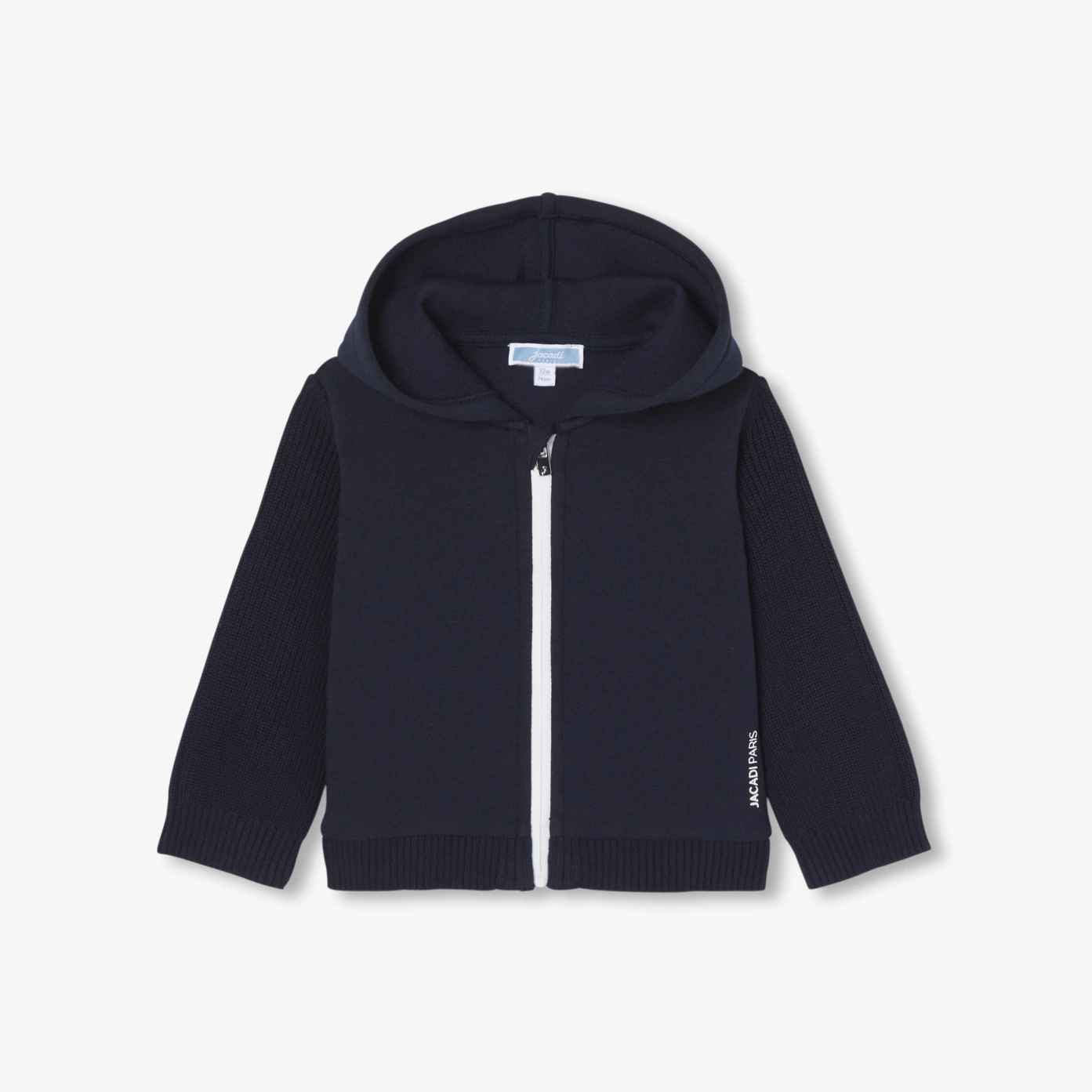 Sens du détail et finitions soignées pour ce sweat zippé bébé garçon. Porté comme une veste d'entrée de saison et parfait pour l'automne, les stylistes ont joué l'effet de matière en déclinant le corps en foam back façon néoprène et les manches en tricot pour une silhouette chic et moderne. Idéal pour le quotidien, accordez-le à un t-shirt manches longues et un jean brut à revers pour une silhouette preppy et citadine.- Corps en foam back façon néoprène- Manches en tricot côte perlée- Capuche- Ouverture zippée