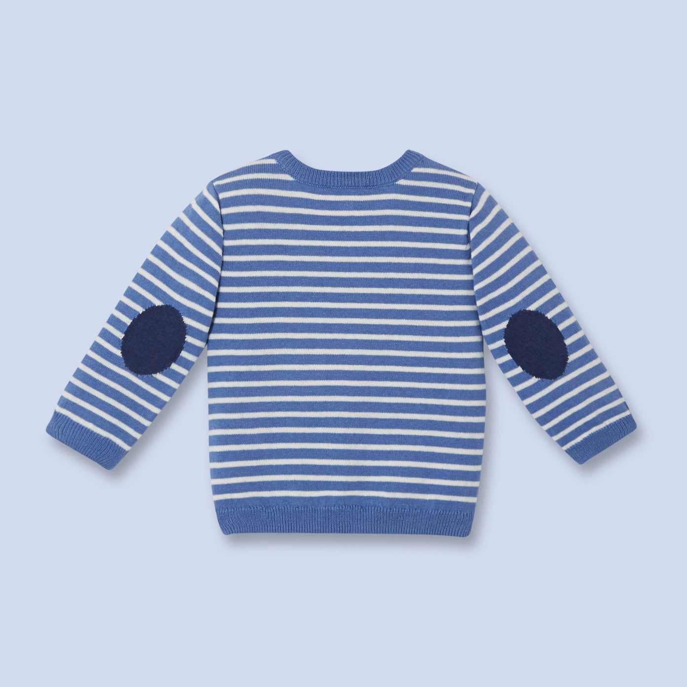 Pour un hiver élégant, le pull du tout-petit se pare de rayures contrastées. Détail des coudières contrastées. Finitions côtelées. Boutons en imitation nacre sur l'épaule gauche.