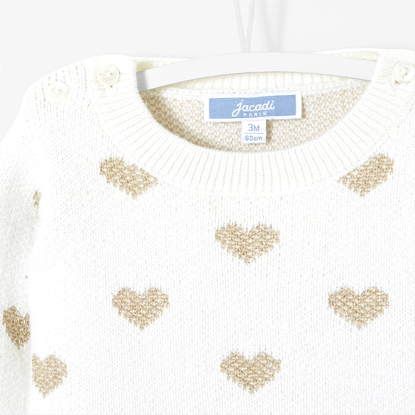 Cette saison ce joli pull en laine et en coton se pare de motifs cœur. Boutonné à l'épaule pour habillage facilité. Il trouvera une place de choix dans le vestiaire des bébés.