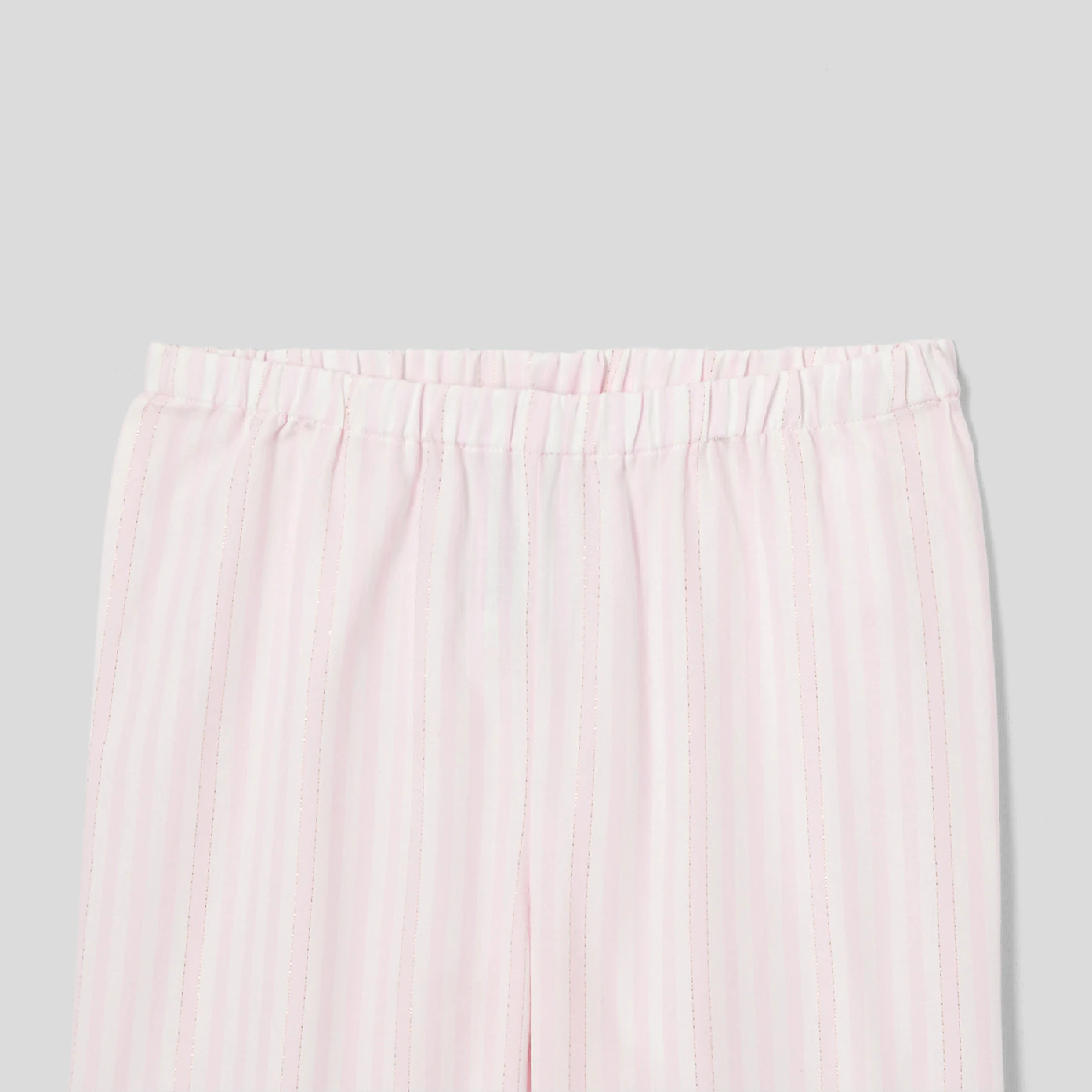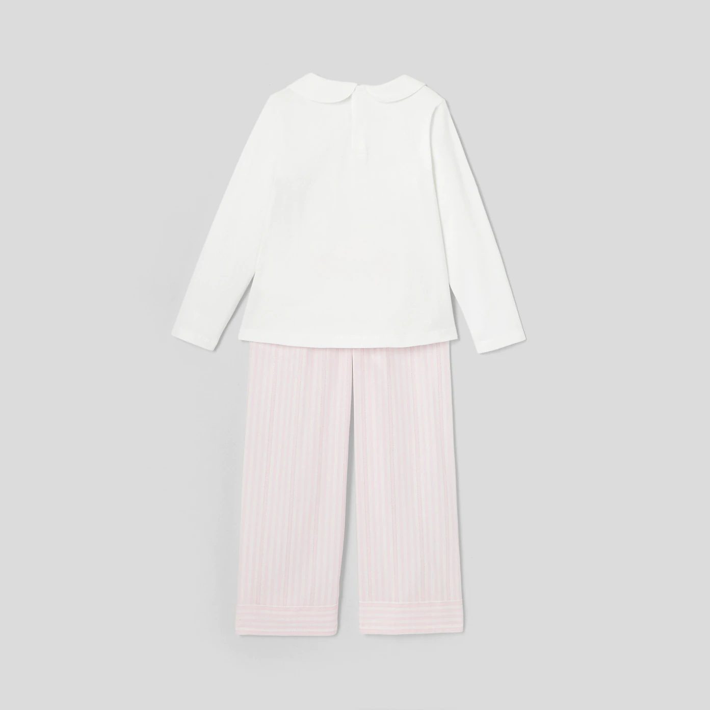 Promesse de douces rêveries, cet élégant pyjama sera parfait pour l'automne. Composé d'un ravissant t-shirt à col Claudine animé d'une petite fille prête à se coucher, un pantalon rayé à détails de Lurex complète ce duo. À porter sous une robe de chambre, votre fille aimera le garder pour flâner le dimanche matin. - Coton organique - Col Claudine - Pantalon rayé à détails de Lurex - Taille élastiquée - Coupe loose
