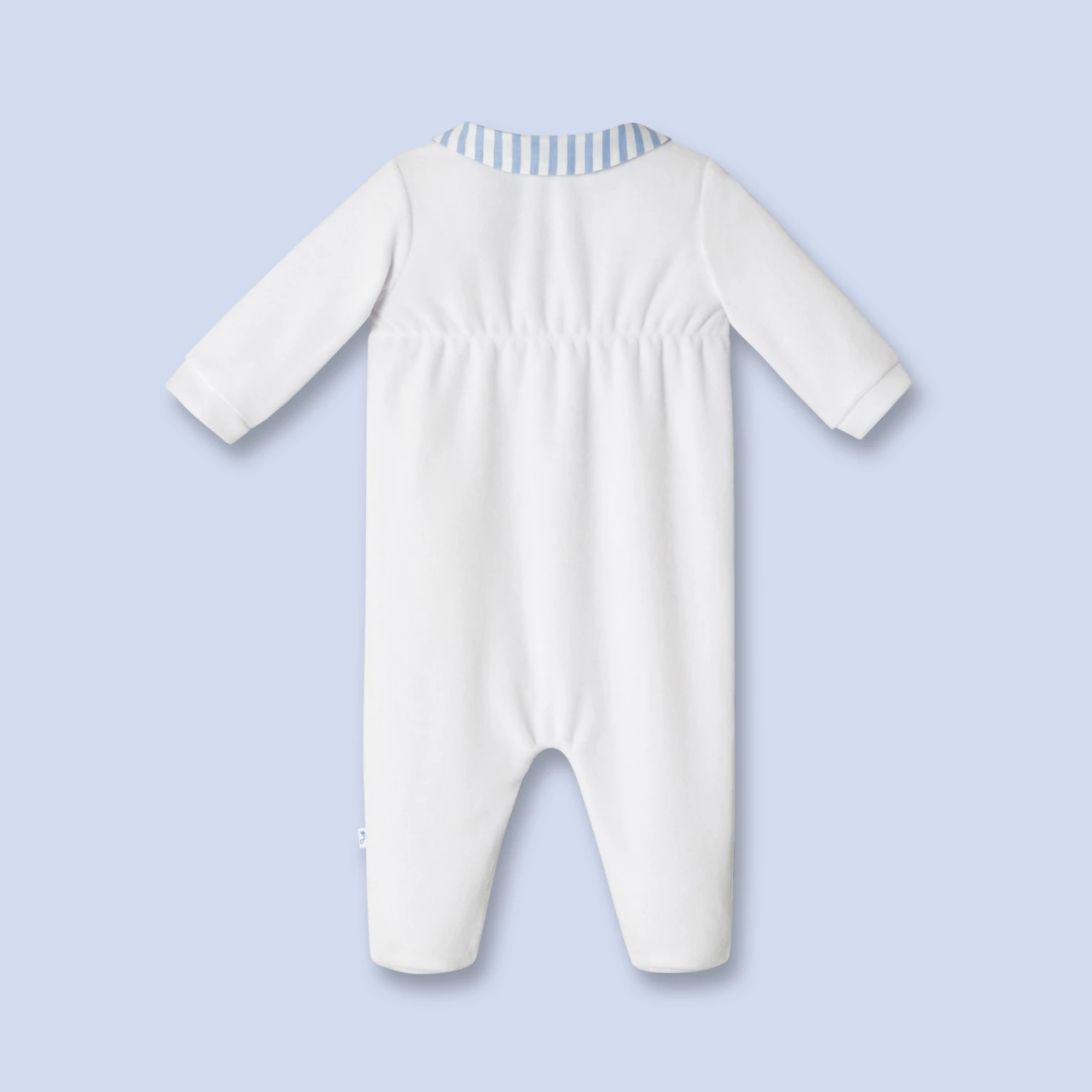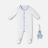 Sobre et chic, le dors-bien du tout-petit est rehaussé d'un col et d'une patte de boutonnage contrastés. Pratique, il est pressionné devant et à l'entrejambe. Détail de la fine étiquette Jacadi sur le côté.Le plus Jacadi : il est accompagné du doudou en vichy.