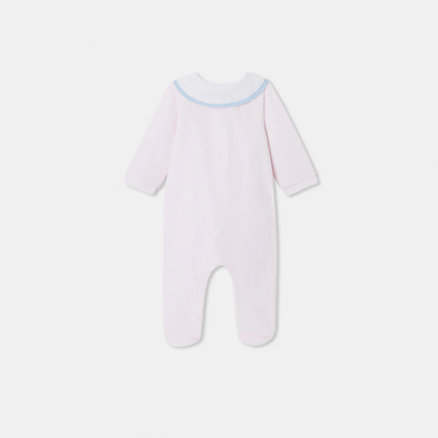 Voici le parfait pyjama bébé fille pour accompagner les nuits de la toute-petite dès l'entrée de saison. En velours doux et souple, s'ouvrant devant pour un habillage facile et sécurisé, un col pétales en popeline à biais contrasté sublime ce modèle chic minimaliste à offrir en cadeau.-Dors-bien en velours-Col pétales en popeline avec biais contrasté-Ouverture pressionnée devant-Idée de cadeau de naissance
