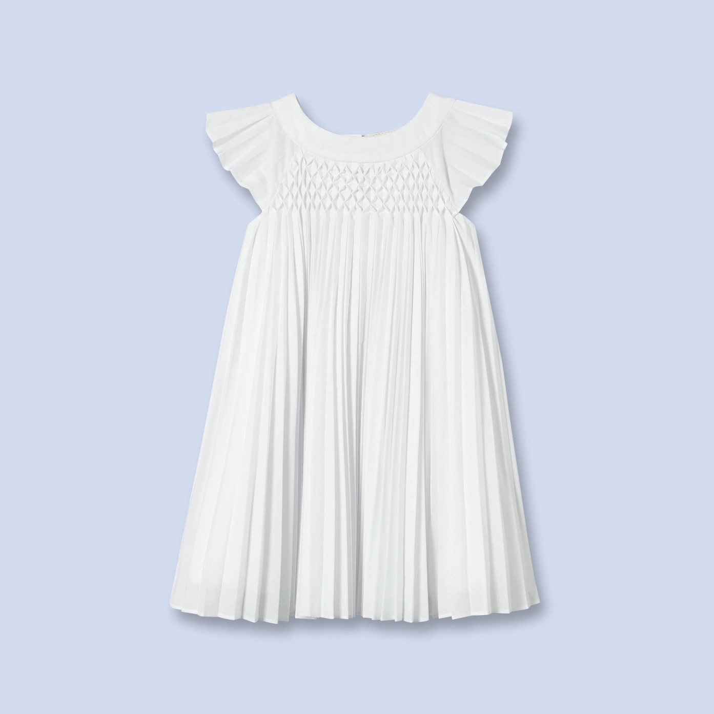 Robe en tissu plissé soleil blanc optique Plis permanents Entièrement doublée en fourreau 100% coton Plastron et encolure smockés main motif graphique Ouverture encolure milieu dos par un bouton et une bride Longueur dessus du genou