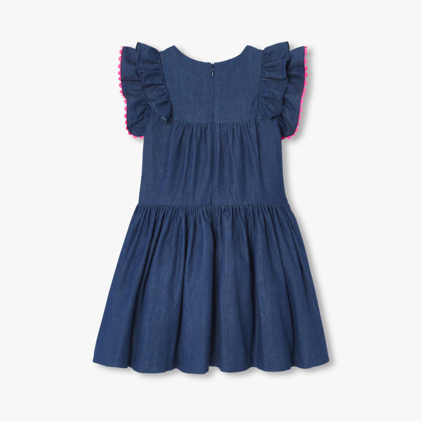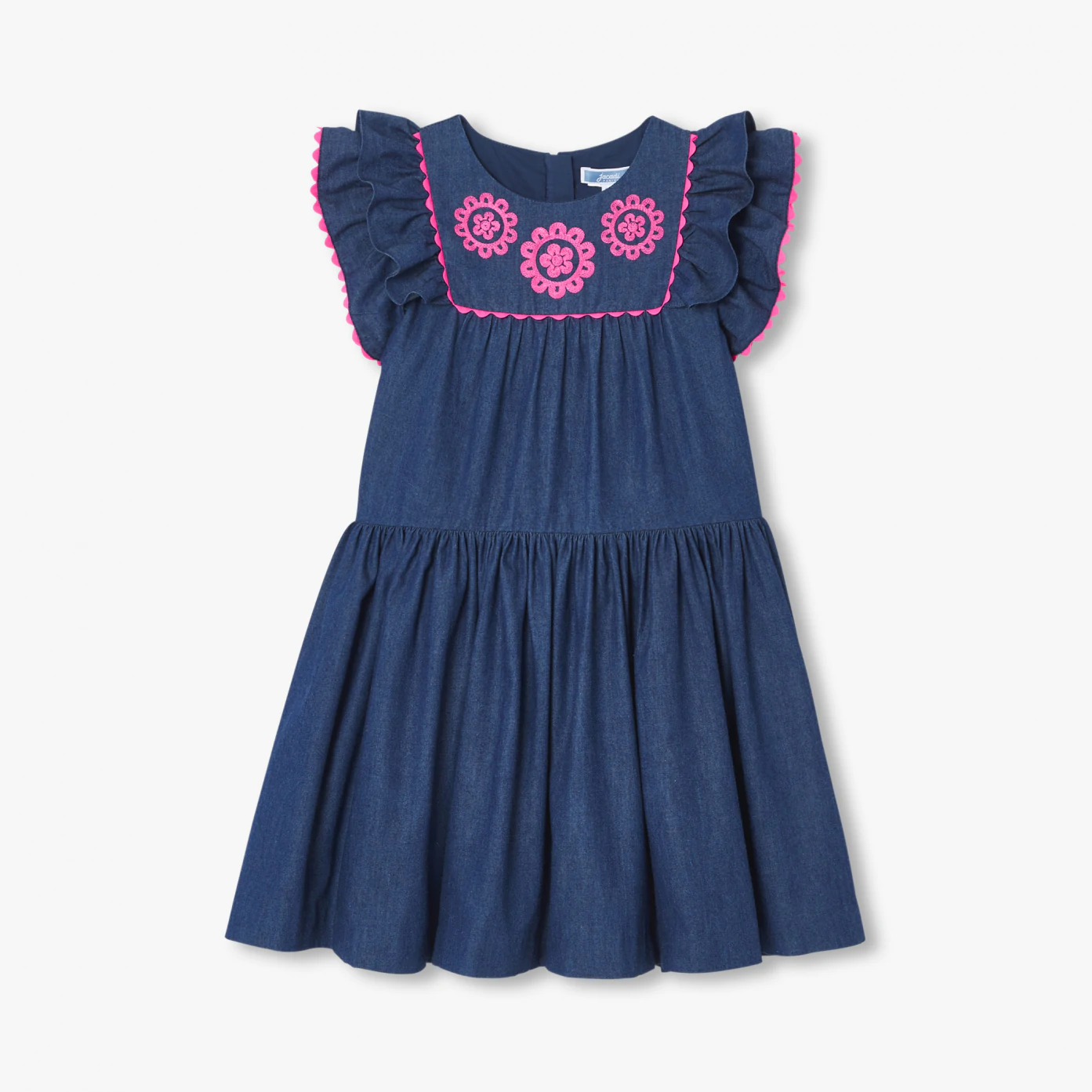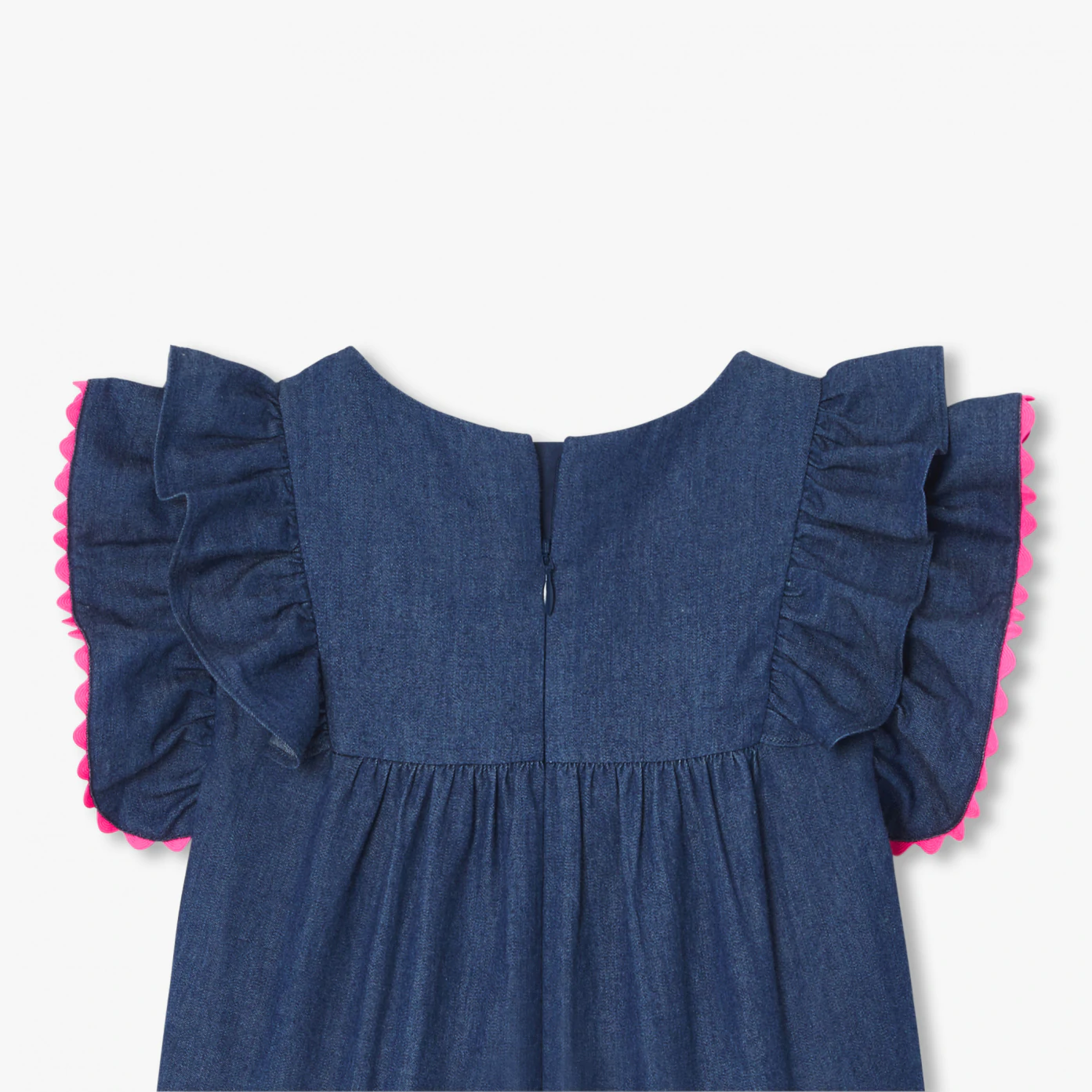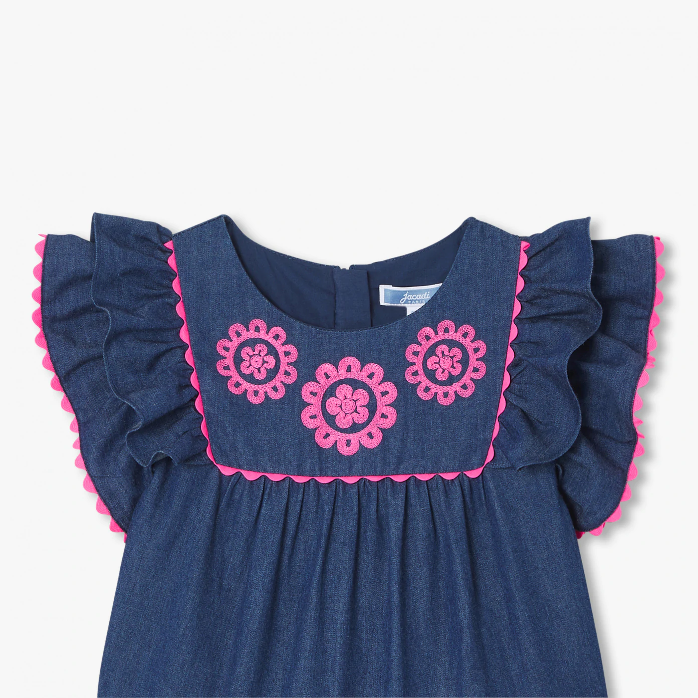 Jacadi sublime la mode enfantine saison après saison en créant des pièces contemporaines comme cette robe fille. Habillée d'un denim léger, brodée de rosaces rose fuchsia sur le plastron et taille basse froncée, emmanchures volantées prêtes à virevolter et doublure en coton finalisent cette pièce folk à porter avec des sandales tout l'été.- Robe fille en denim léger- Rosaces brodées sur plastron- Emmanchures volantées- Découpe taille basse froncée- Doublure en coton- Ouverture au dos par zip invisible