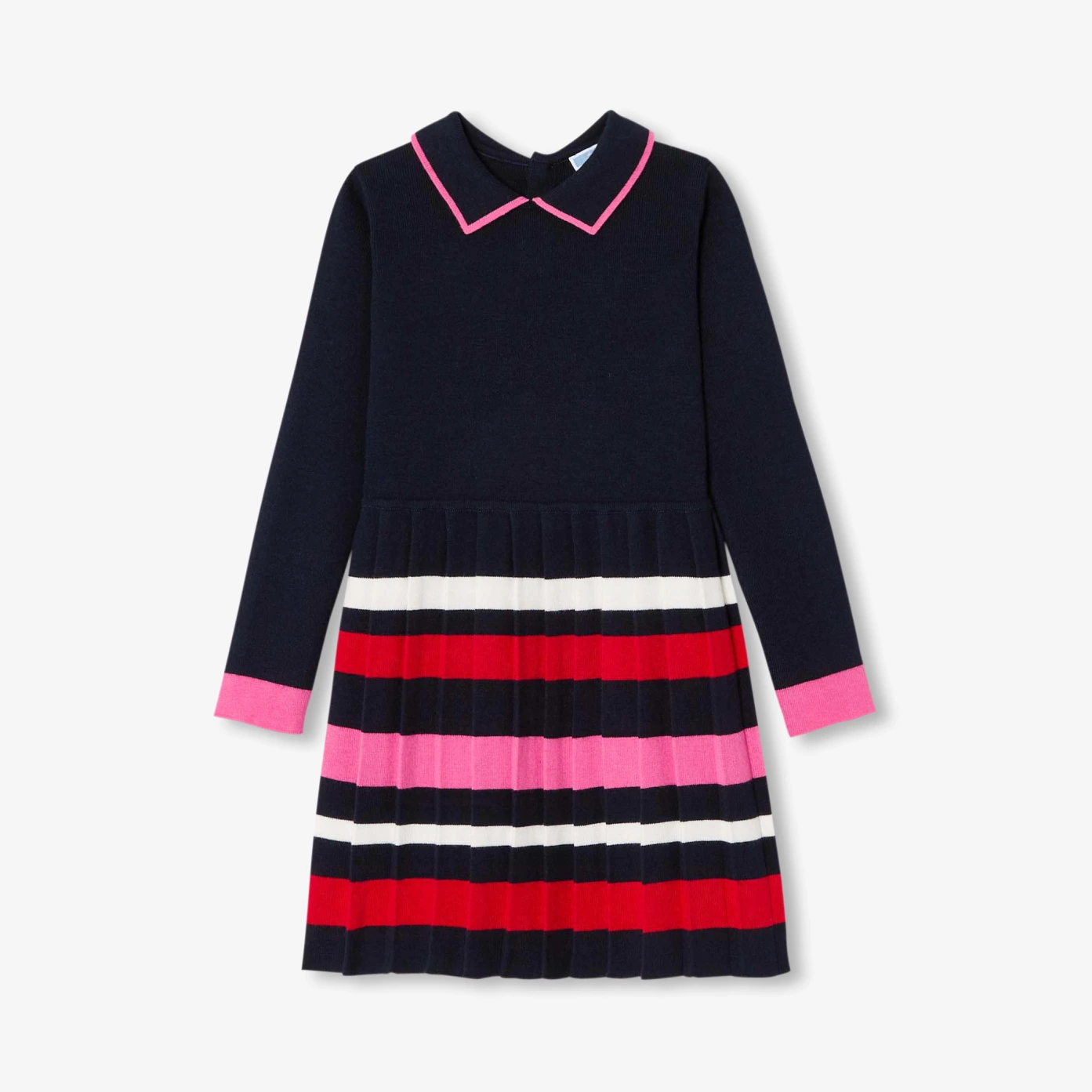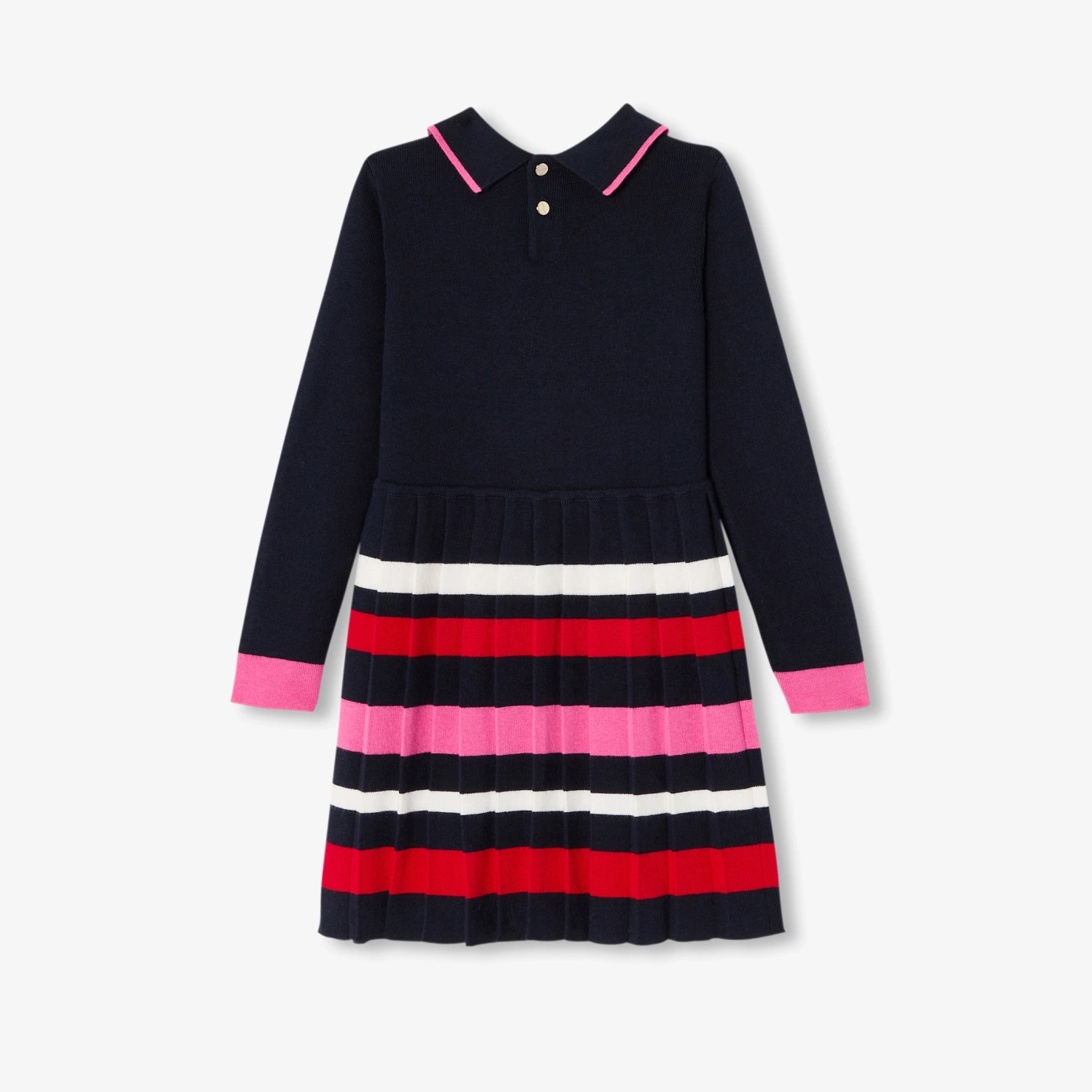 Aussi chic que graphique, cette élégante robe enfant fille dévoile tout le savoir-faire Jacadi. En tricot alliant coton et touche de cachemire, col polo, bas de manches contrastés et base plissée rayée dynamisent ce modèle à faire tournoyer dès la rentrée avec des salomés aux pieds.- Robe en tricot- Col polo à liseré contrasté- Bas de manches contrastés- Jupe en plissé permanent- Ouverture par boutons à queue au dos