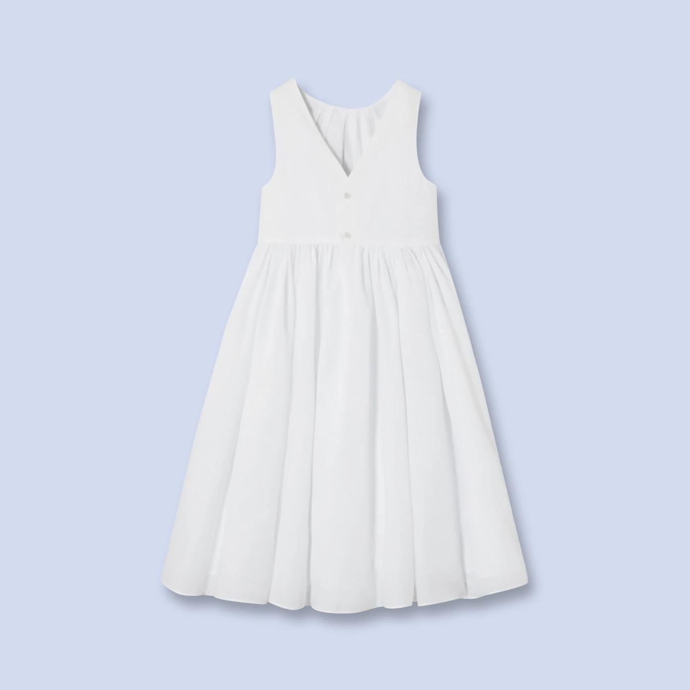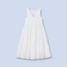 Pour un cortège immaculé, la robe blanche de la petite fille est en popeline et voile de coton. Jeu de fronces pour un effet de volume. Au dos, boutons en imitation nacre. Doublée de voile de coton.