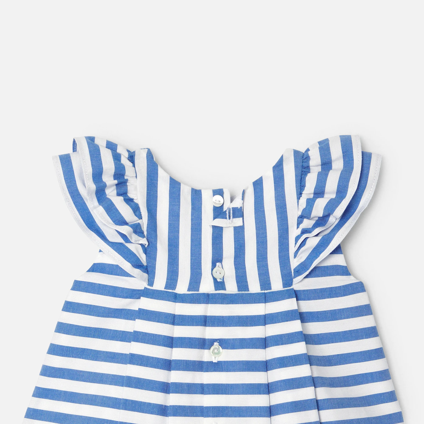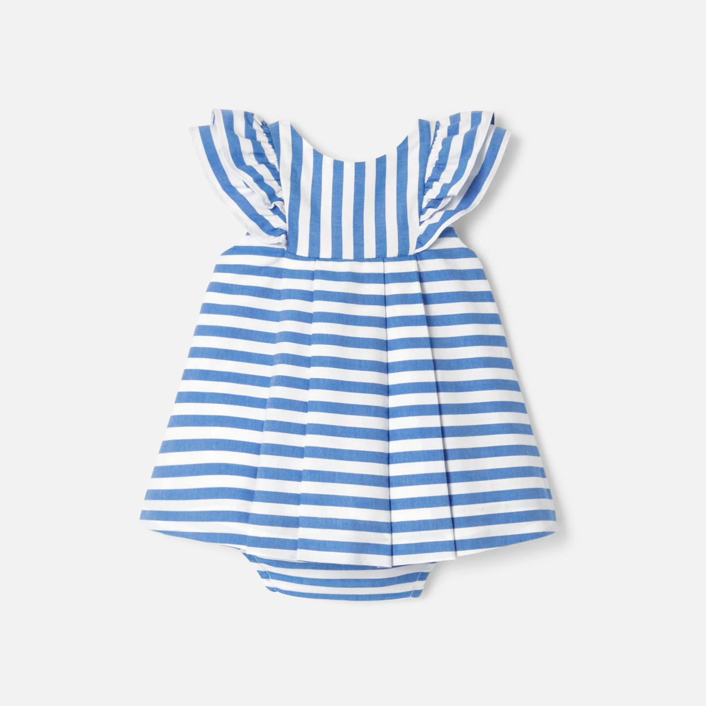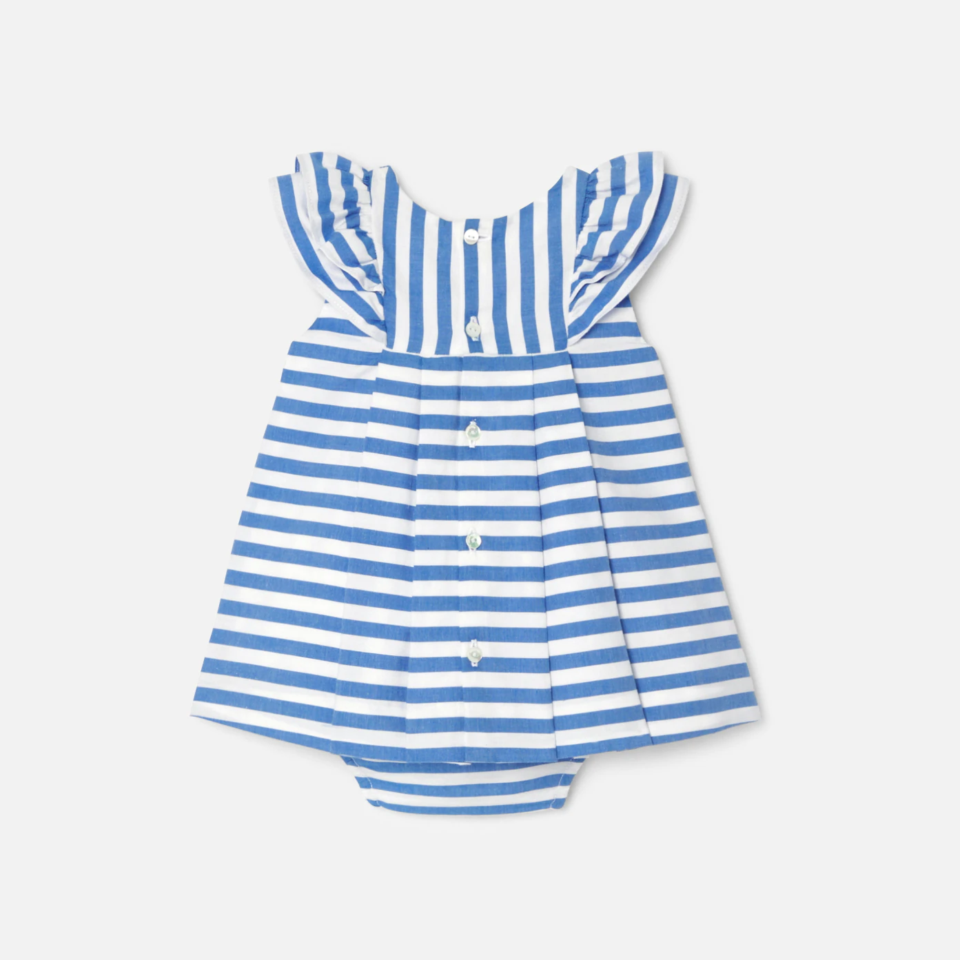 Cette robe bébé fille traversera la saison avec élégance. En Oxford de coton rayé doux et léger, des volants aux épaules structurent cette pièce graphique entièrement doublée pour un maximum de confort. Accompagnée d'une culotte élastiquée pour parfaire la tenue, offrez-lui ce ravissant duo pour son premier été.- Robe bébé fille en coton biologique- Épaules volantées- Ouverture par boutons en nacre naturelle au dos- Plis devant et dos pour un beau volume- Doublure en popeline- Culotte élastiquée